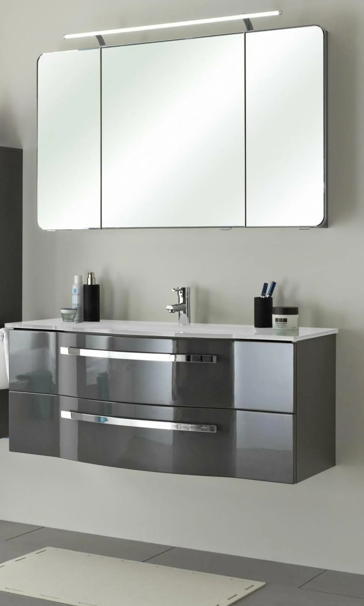Schaffen Sie sich einen Nassbereich in dem Sie sich wohlfühlen mit dem Badezimmerset Fokus der Marke pelipal. Das edle Design des Sets setzt sich aus Fronten und Korpus in Lack Grau und Bügelgriffen in Chrom Glanz zusammen. Bestehend aus einem Glaswaschtisch aus weiß lackiertem Klarglas mit Armaturbohrung und integriertem Überlauf, einem Waschtischunterschrank inklusive zweier Auszüge und einem Spiegelschrank mit LED-Beleuchtung im Kranz und drei Spiegeltüren finden Kosmetika, Handtücher und sonstige Hygieneartikel ausreichend Platz in Fokus.