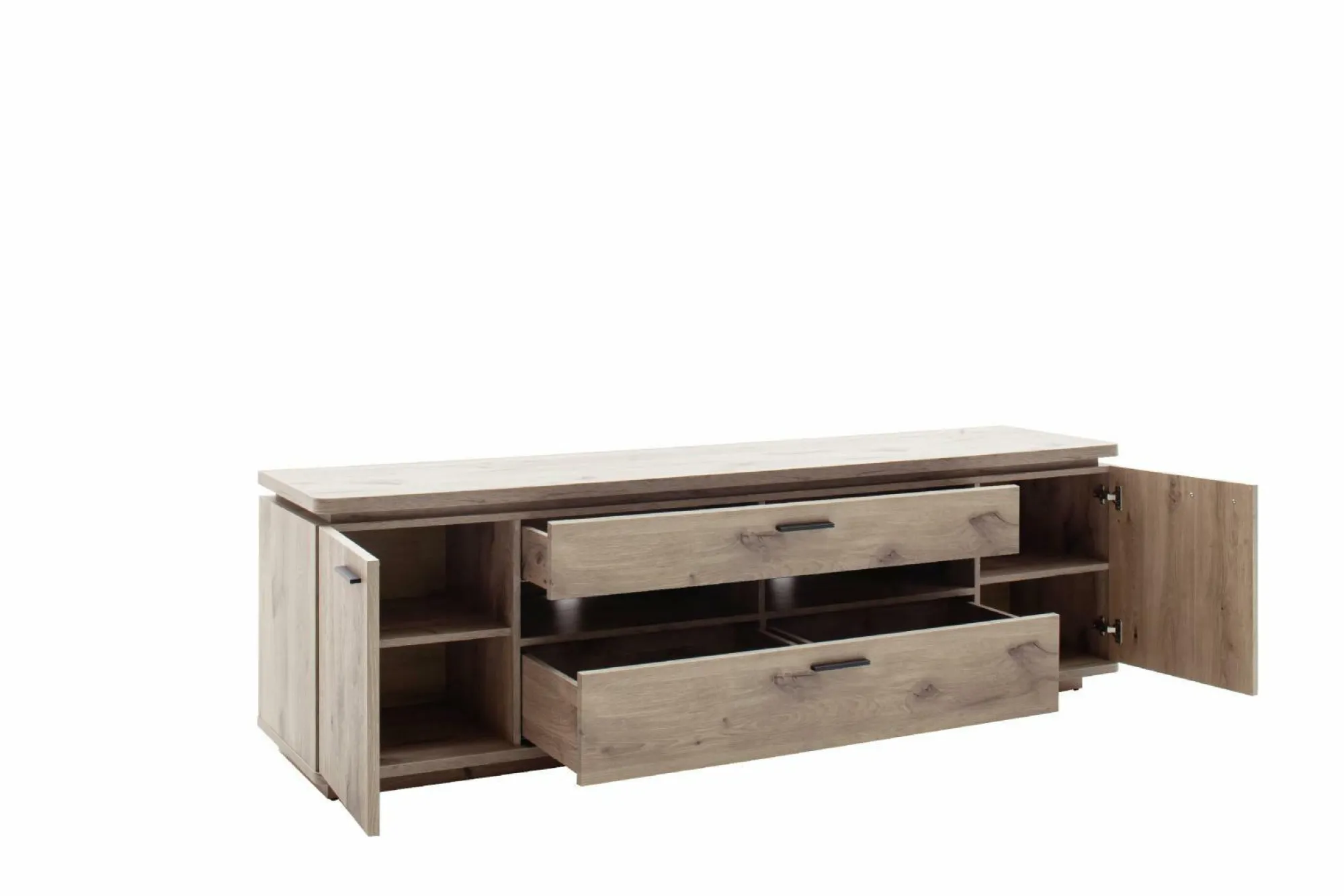 Das Lowboard MARSEILLE der Trendmarke HARPER überzeugt mit einem modernen und zugleich zeitlosen Design. Das Lowboard verfügt über zwei leichtgängige Türen, zwei offene Fächer, sowie drei gedämpfte Schubkästen und bietet somit vielseitigen Stauraum. Der Korpus und die Front erscheinen in robustem Dekor in der Ausführung Viking Oak. Eine Absetzung aus anthrazitfarbigem Dekor, sowie die sichtbare Rückwand in der Ausführung Viking Oak Dekor in sandgestrahlter 3D Eichenholzoptik bieten einen stilvollen Kontrast. Eine stimmungsvolle Oberbodenbeleuchtung ist inklusive. Auf Wunsch ist eine passende Funkfernbedienung erhältlich. Das Lowboard bietet Platz für einen Fernseher bis zu einer Größe von 80 Zoll.