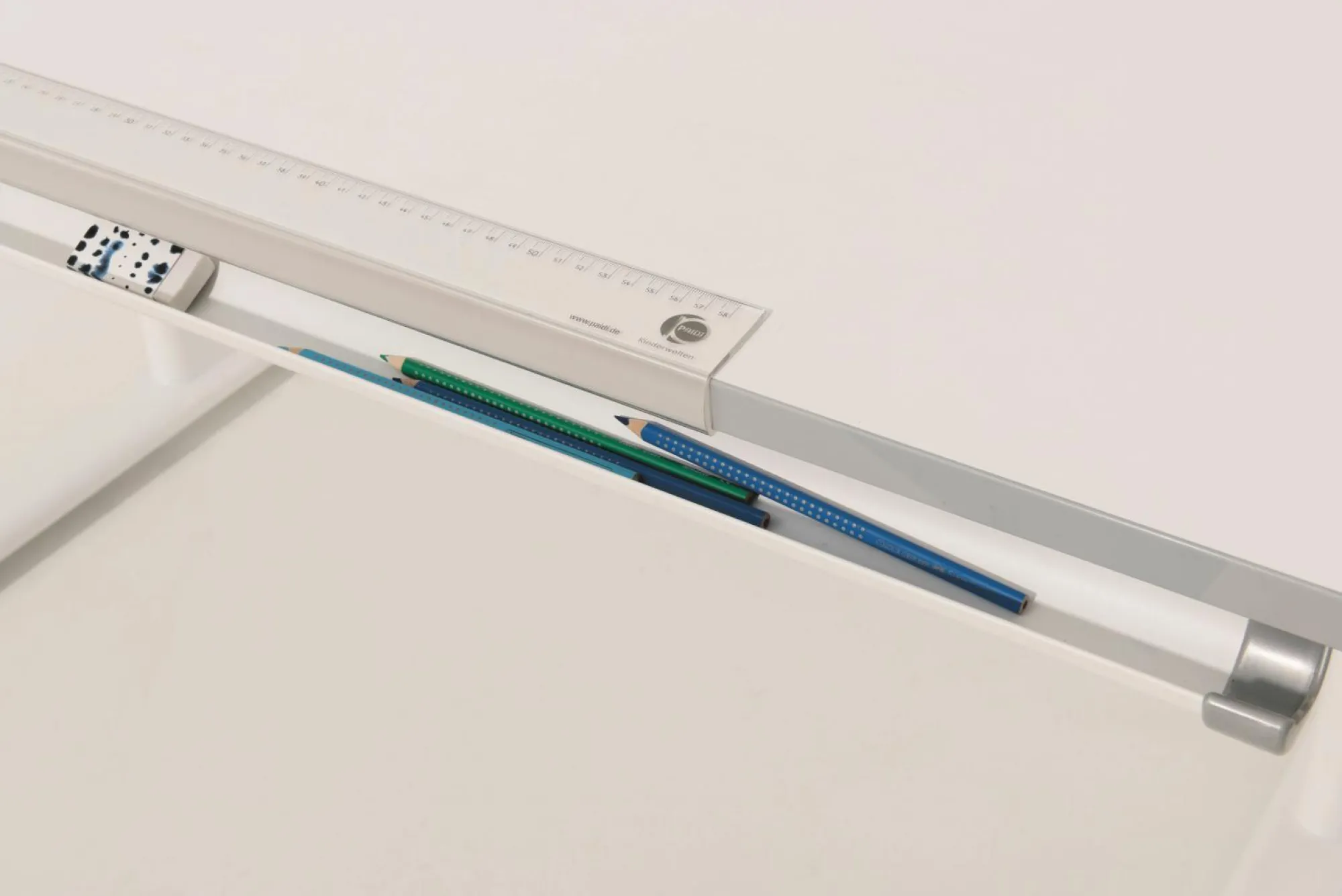 Der Schreibtisch Diego 130 GT aus dem Hause PAIDI verbindet ergonomisches Lernen mit einem schicken Design, welches sich wunderbar in nahezu jeden Einrichtungsstil integrieren lassen wird. Die schrägstellbare Tischplatte (90 cm) und der feststehende Teil (37,5 cm) sind kreideweiß und mit einer umlaufenden Kante in grau versehen. Die neigbare Platte lässt sich in einem Bereich bis 19° durch zwei hochwertige Raster-Schere verstellen. Das Schreibtischgestell ist in einem weiß gehalten und rundet das Design perfekt ab. Durch die Kurbel lässt sich der Tisch von 53 cm bis 79 cm individuell höhenverstellen und ermöglicht somit bequemes Lernen. Die Tischplatte ist zudem mit einem praktischen Streifenbürste aus Polypropylen, einem 60 cm Lineal, einer Ablagemulde und Taschenhaken ausgestattet.