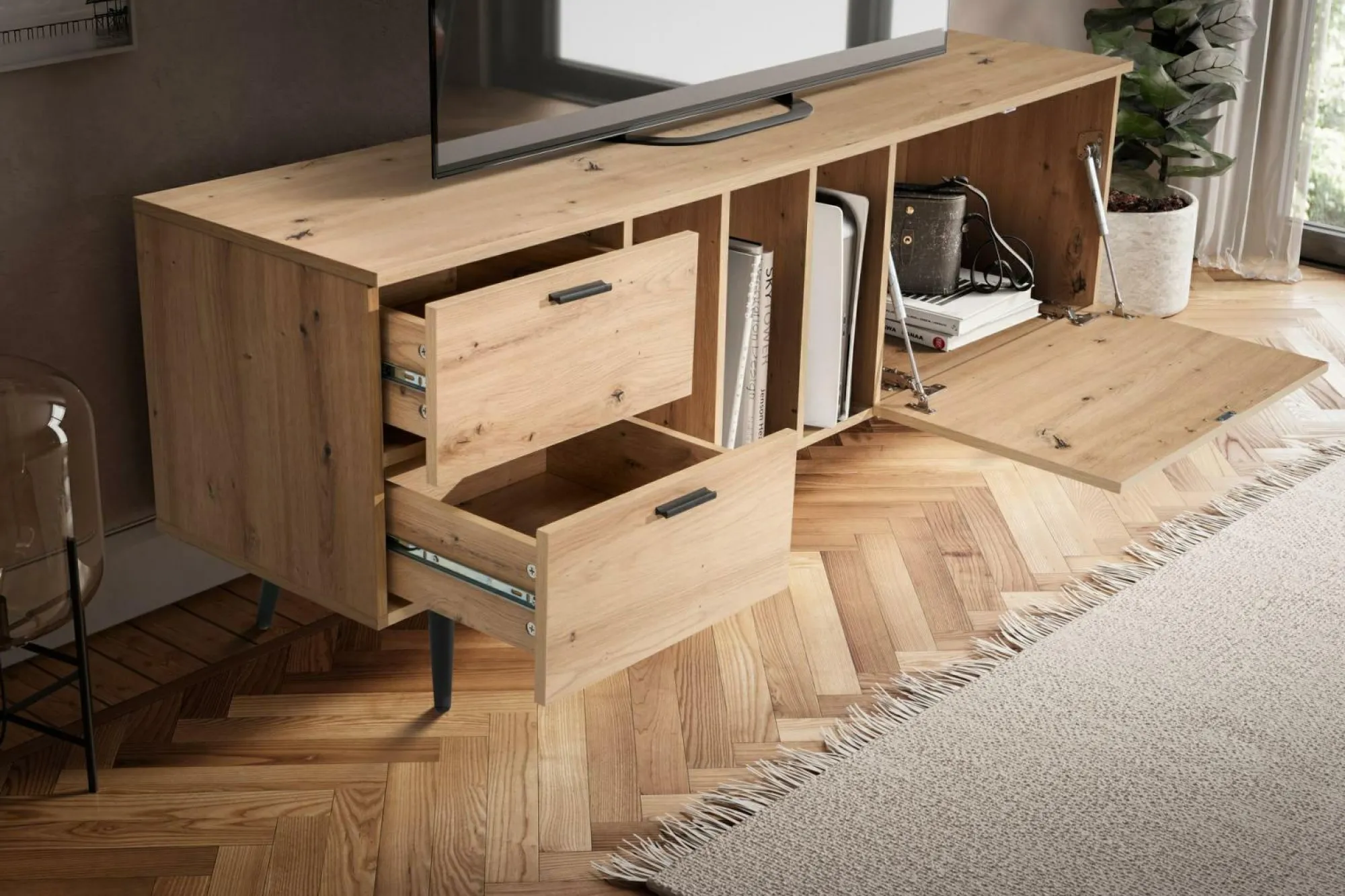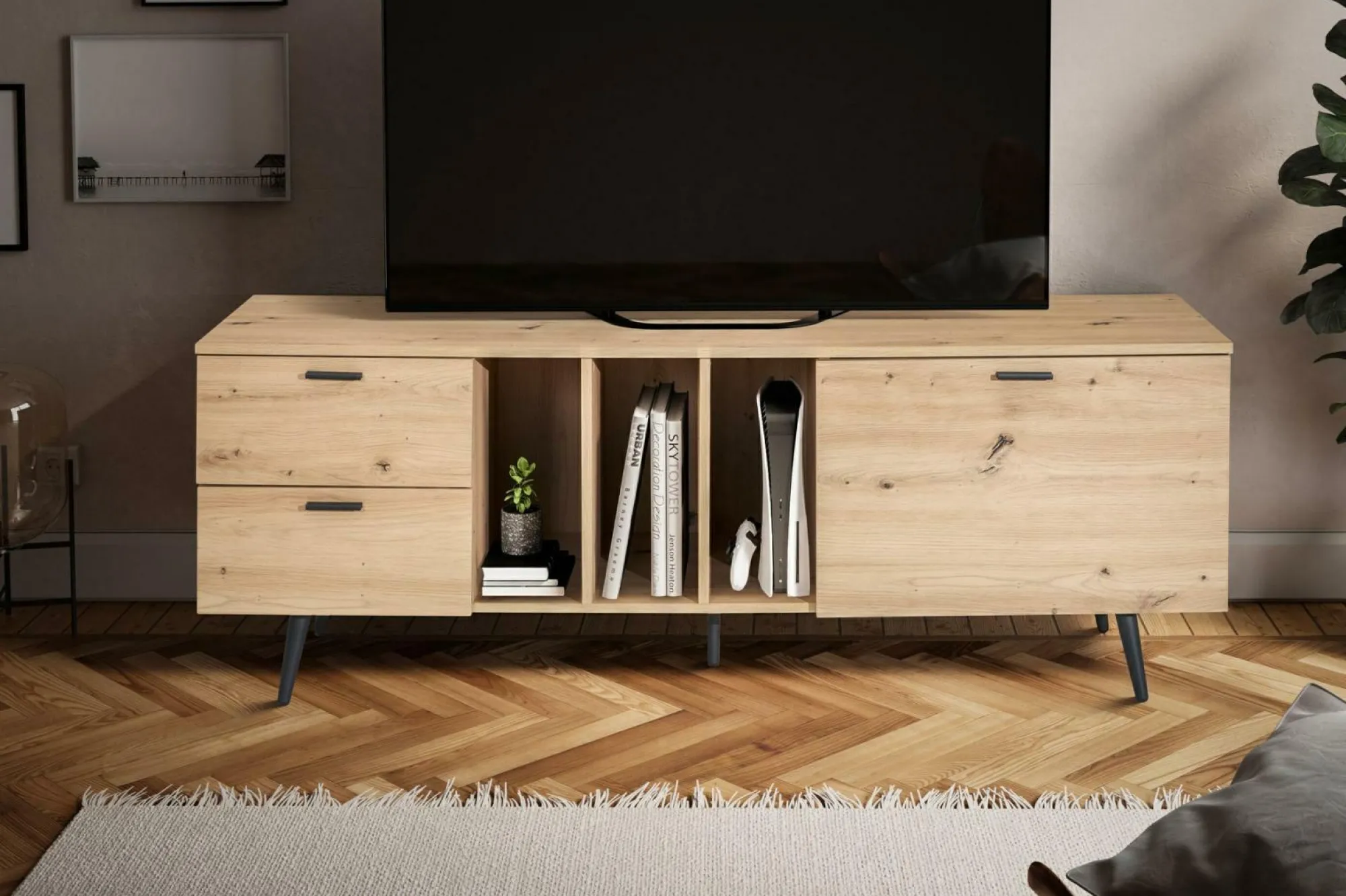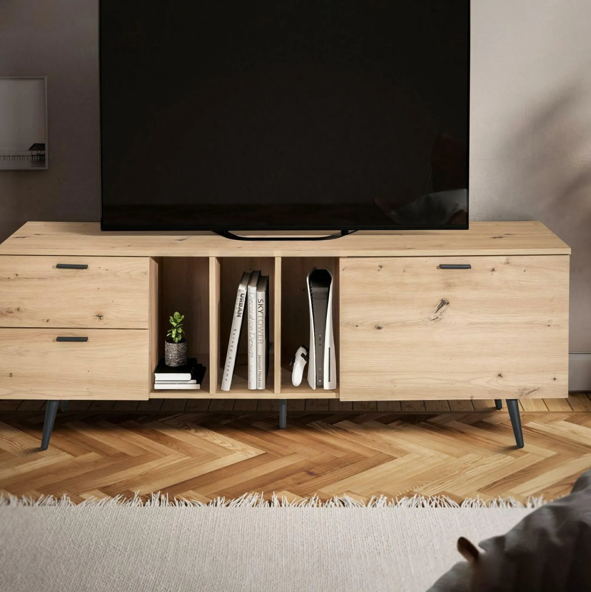 · Moderner Look – Dieser Fernsehtisch im Eiche-Dekor ist der ideale Platz für Fernseher mit bis geräumigen Schubladen und einem Türfach,