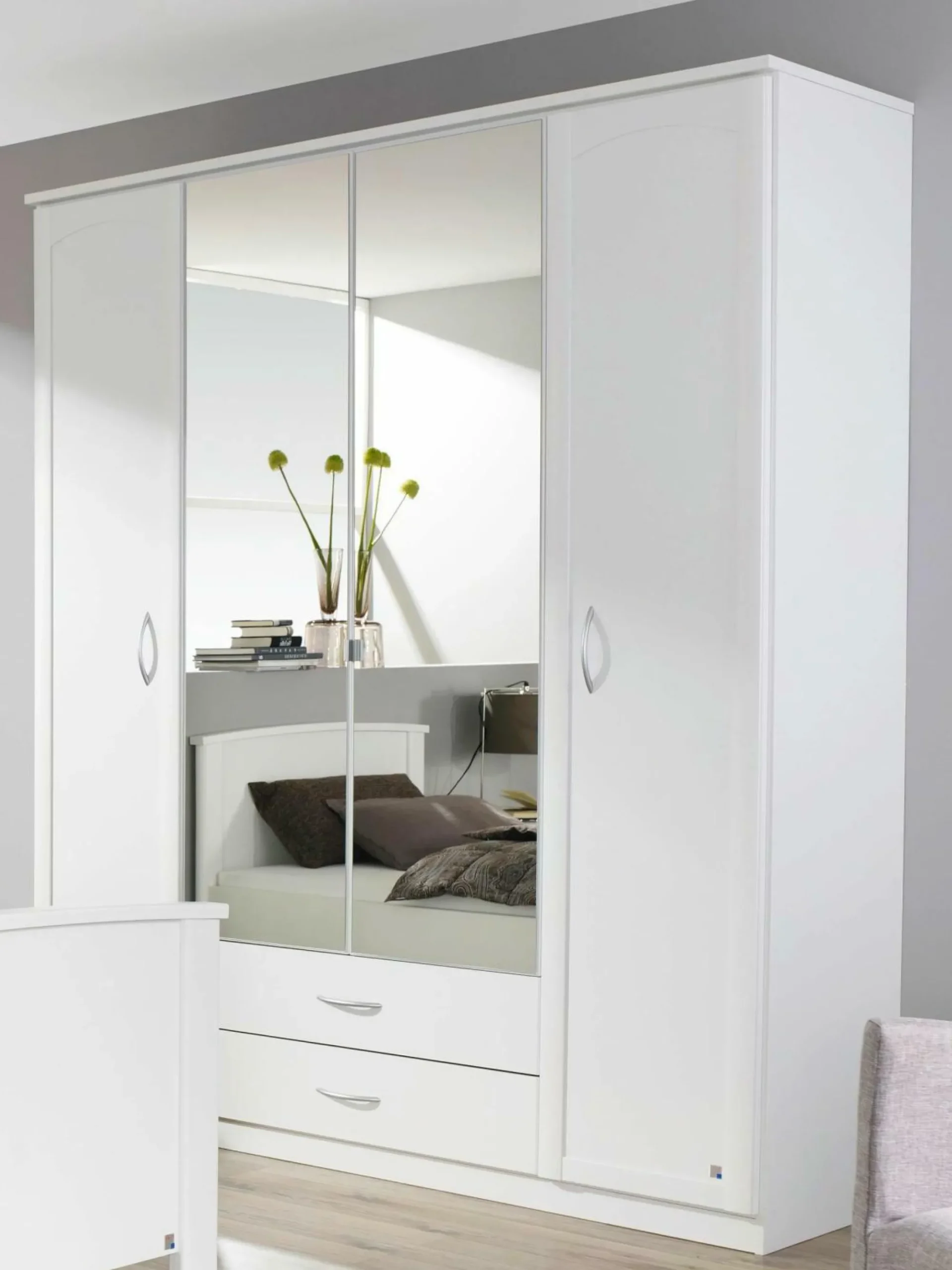 Der Kleiderschrank Torrent von rauch begeistert mit viel Stauraum für Ihre Textilien. Der geräumige Drehtürenschrank verfügt über vier Türen, davon die zwei mittigen mit Spiegeln und zwei Schubkästen (45/90/45 cm). Der Schrank verfügt über eine Kranzblende und alufarbige Griffe, die den alpinweißen Schrank optimal ergänzen. Hinter den Türen und Schubkästen können Sie Ihre Kleidung und Zubehör ordentlich aufbewahren. Der helle Schrank passt zudem in verschiedenste, modern eingerichtete Schlafzimmerstile.