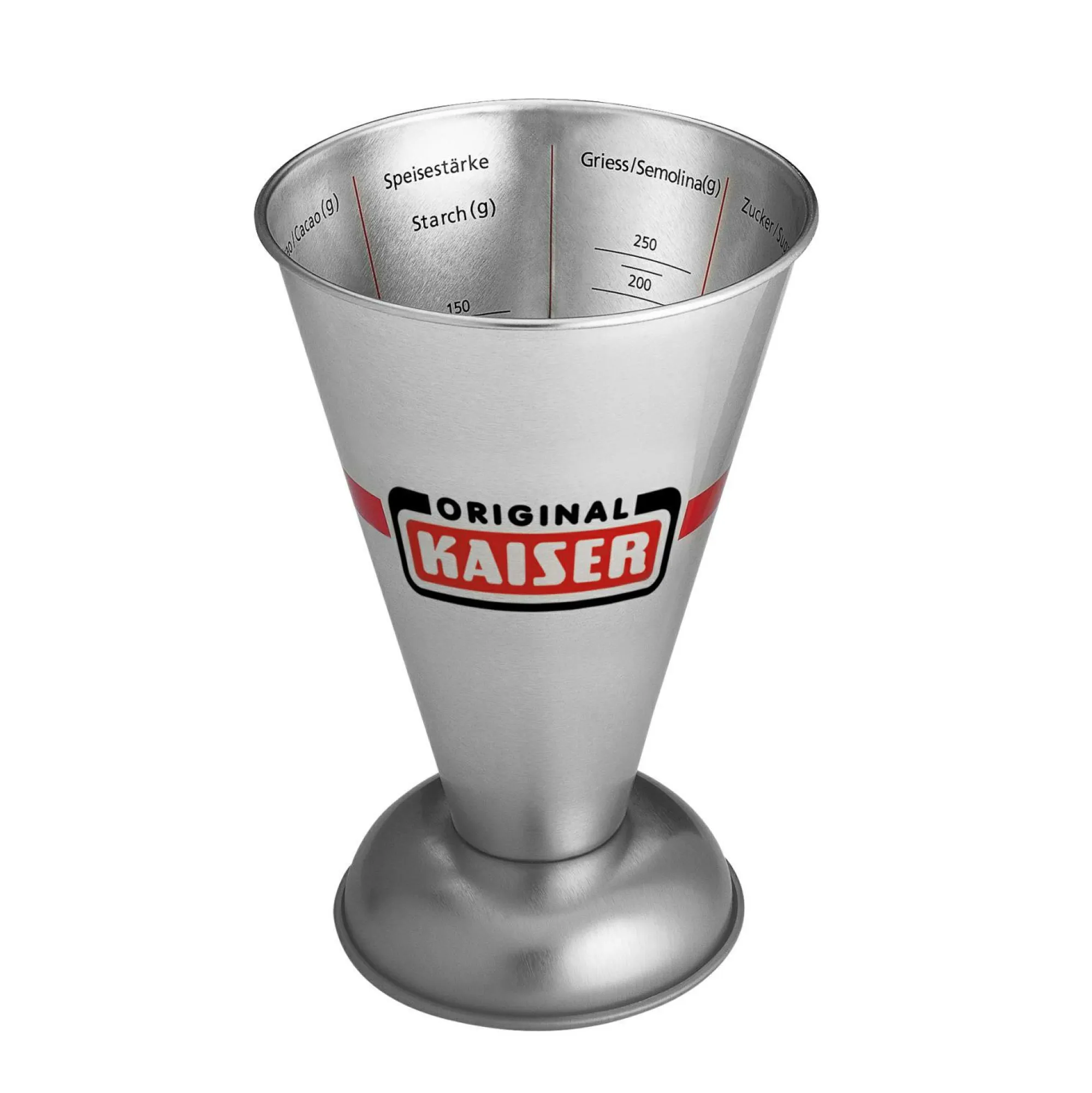 Der standfeste Messbecher aus Metall kann eine Waage praktisch ersetzen. Verschiedene Skalen zeigen nicht nur Flüssigkeiten sondern auch Gewicht an.