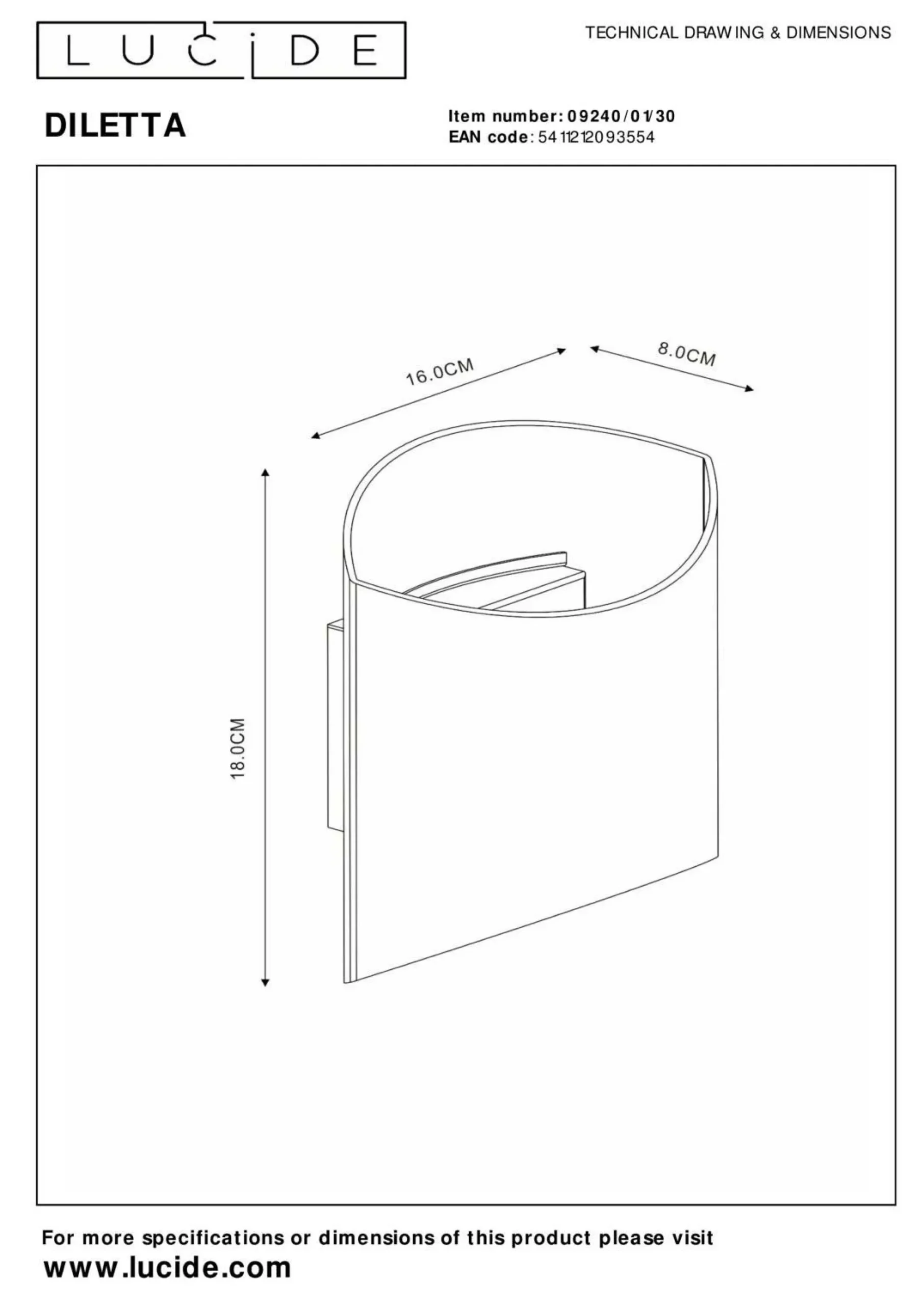 · Mangelt es Ihrer Einrichtung noch an Klasse und Stil? Mit Diletta ist das Problem im Handumdrehen gelöst. Diese elegante Wandbeleuchtung begeistert durch ihr fließendes, halbkreisförmiges Design. So bietet Diletta gleichzeitig Uplight und Downlight, wobei die Lichtquelle zwischen hochwertigem Aluminium verpackt ist. Ihre kompakten Abmessungen von 16 x 8 x 18 Zentimetern und ihr geringes Gewicht tragen zum zeitlosen Charakter von Diletta bei. Schließen Sie diese Lampe an einen Dimmer an, um in jedem Raum Ihres Zuhauses noch mehr Atmosphäre zu schaffen.