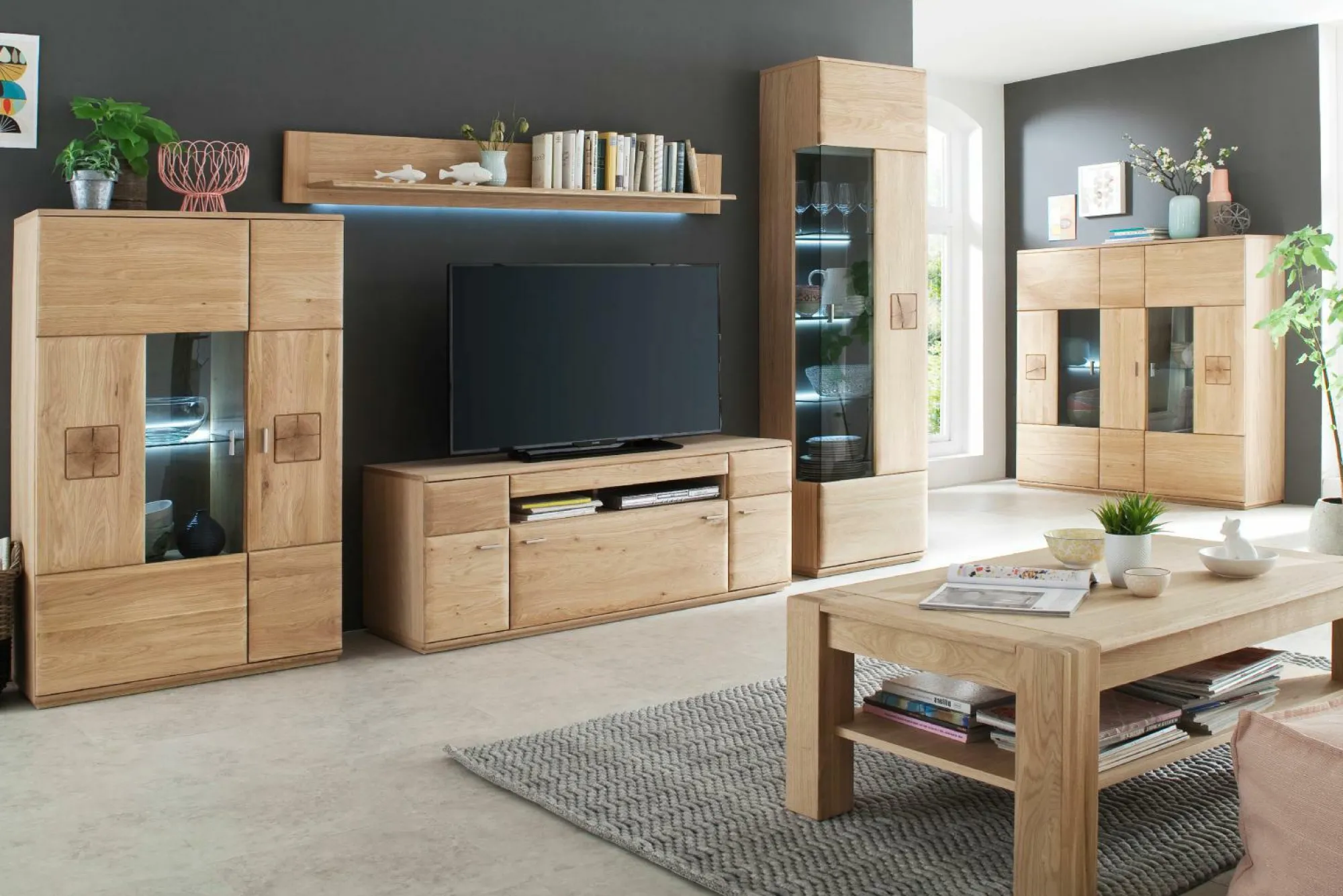 Front: Eiche Bianco massiv geölt mit Hinholz Applikationen Korpus: außen Eiche Bianco furniert innen Eiche Bianco Nachbildung Glas in Parsol grau Rückwand hinter Glas: taupefarbig lackiert Schubkästen und Glastüren gedämpft >>> Preis ohne Beleuchtung <<>> Maße ca. Montagemaße <<<