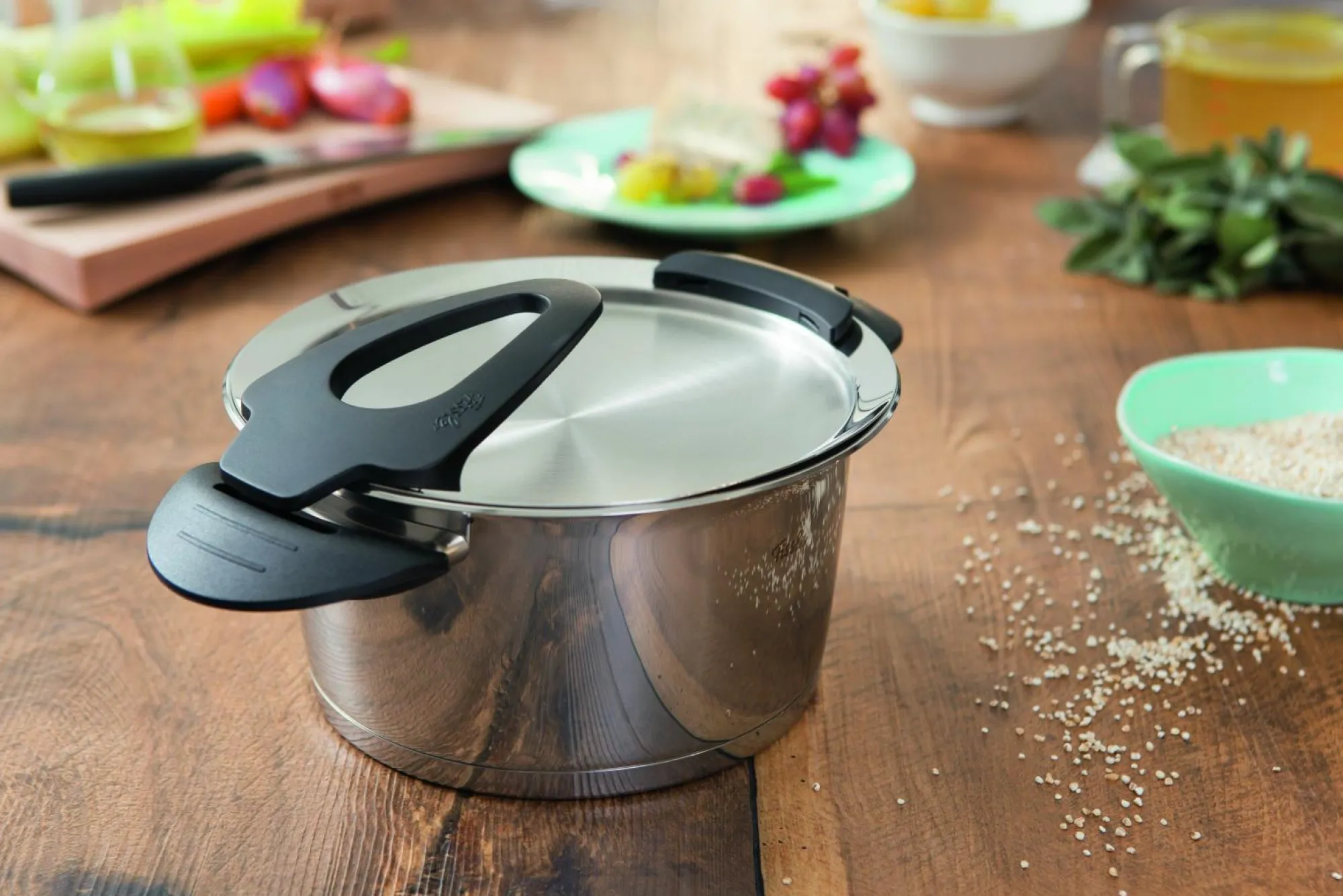 Das intelligente Topfset punktet vor allem durch seine integrierte Deckelablage. Der Deckel kann einfach in der Ablage festgesteckt werden, so bleibt Ihre Küche sauber und vermeidet das umständliche Ablegen des Deckels. Mit der raffinierten Abgießfunktion in Kombination mit dem extrabreiten Schüttrand lässt sich Flüssigkeit ganz leicht abgießen. Ein weiteres Highlight bringt die Stapelfunktion mit sich. Alle Töpfe, auch gleichen Durchmessers, lassen sich aufgrund der leicht konischen Form platzsparend stapeln.