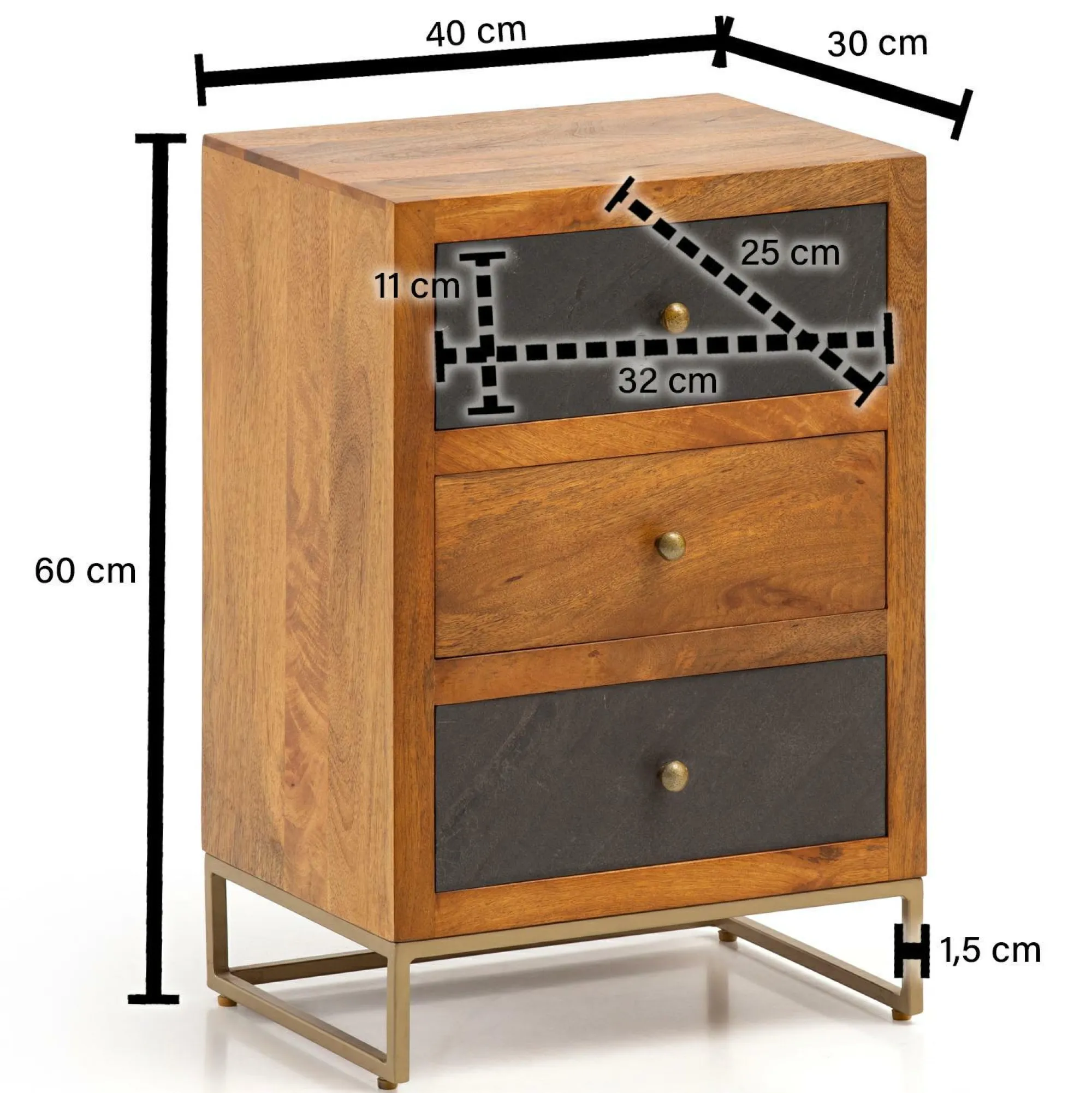 · Abmessungen – Innenabmessungen je Schublade (BxHxT): 32 x 11 x 25 cm, Tischplattenstärke: ca. 1 cm.