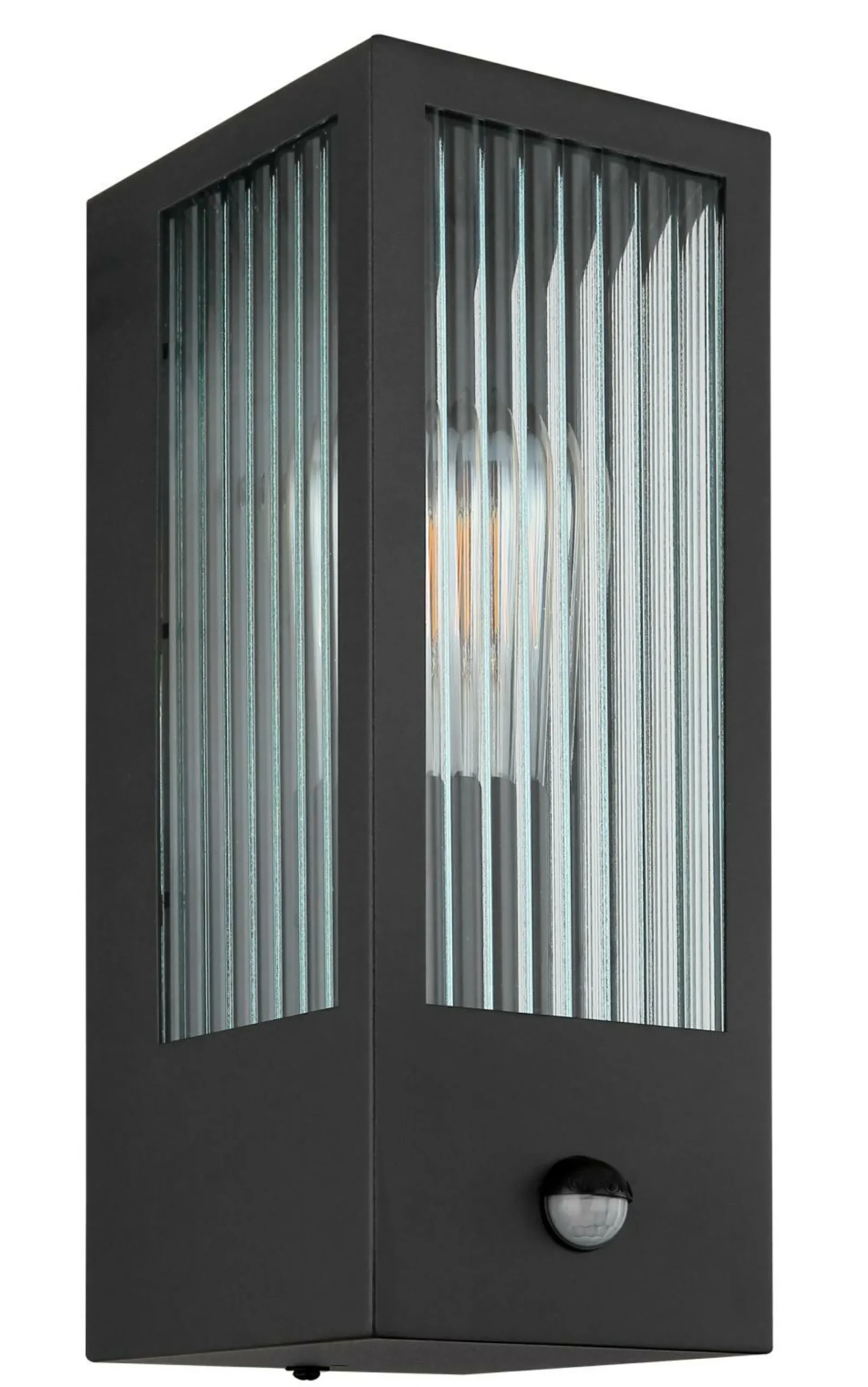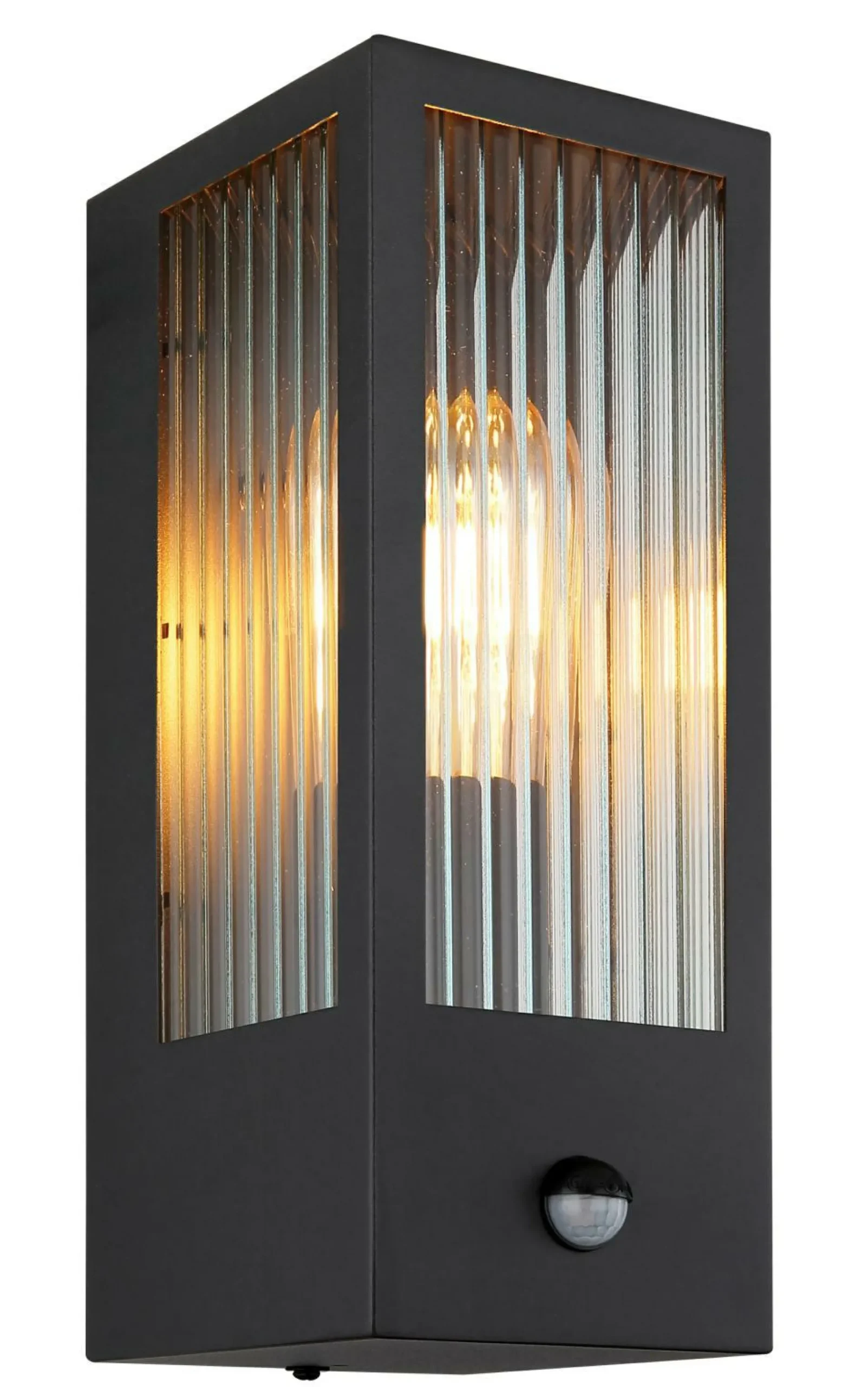 · Diese moderne Außenleuchte überzeugt durch Ihr schönes Design aus Glas und Metall. Die Leuchte in Schwarz besteht aus einem rechteckigen Metallkäfig (12x32cm) und einer schönen Glaswand mit Verzierungen an jeder Seite. Die E27 Fassung ermöglicht Ihnen Lichtfarbe und Helligkeit bis zu einer maximalen Leitung von 60 Watt, selbst zu bestimmen.  Ein weiteres Highlight dieser Leuchte ist der integrierte Sensor, dieser reagiert bei einer Reichweite von 4-8 m und 110°. Der Schutzgrad IP44 gegen Spritzwasser sorgt das Anbringen der Leuchte im Außenbereich.