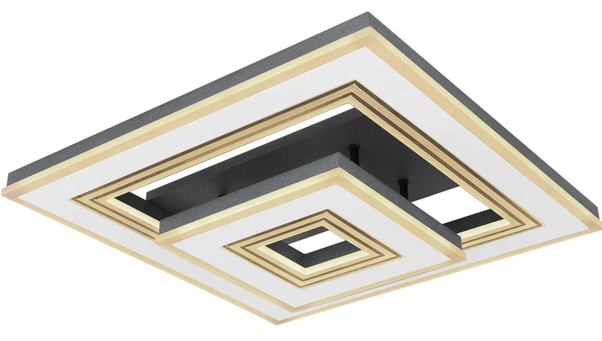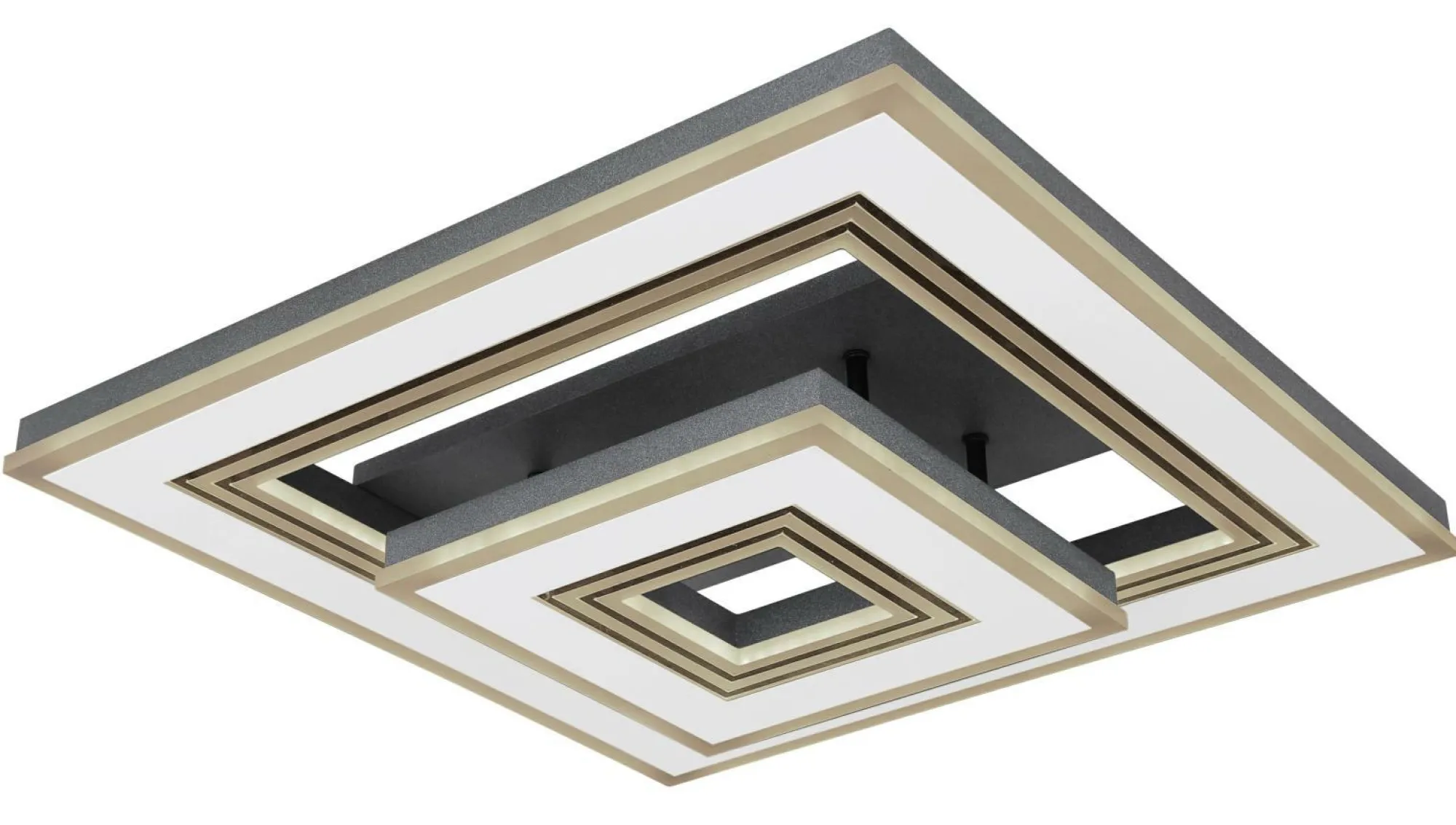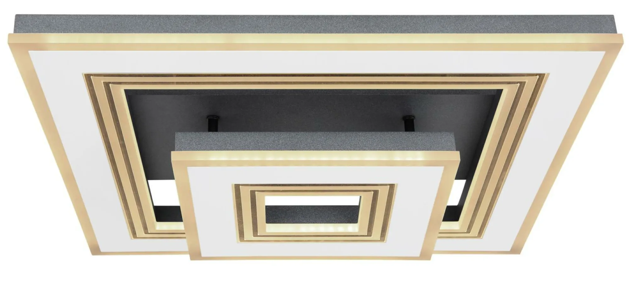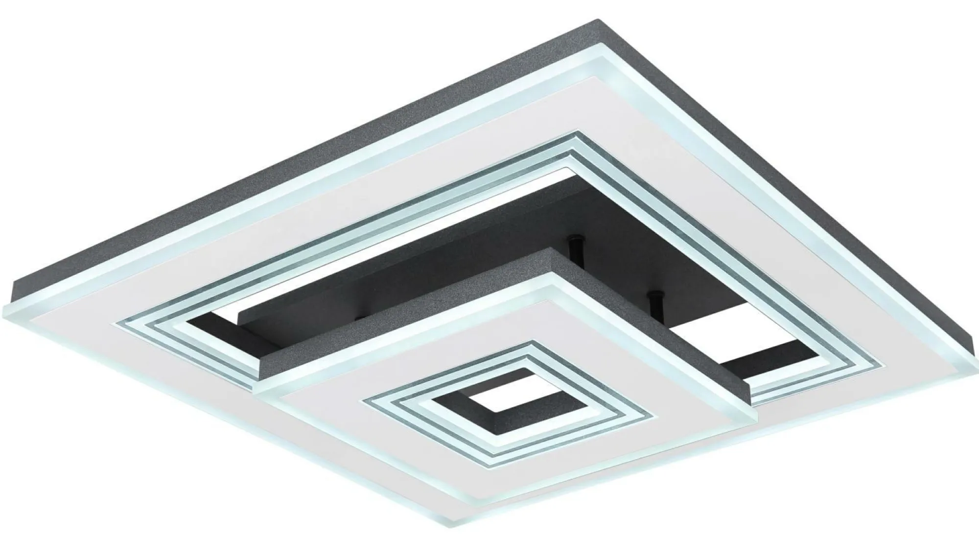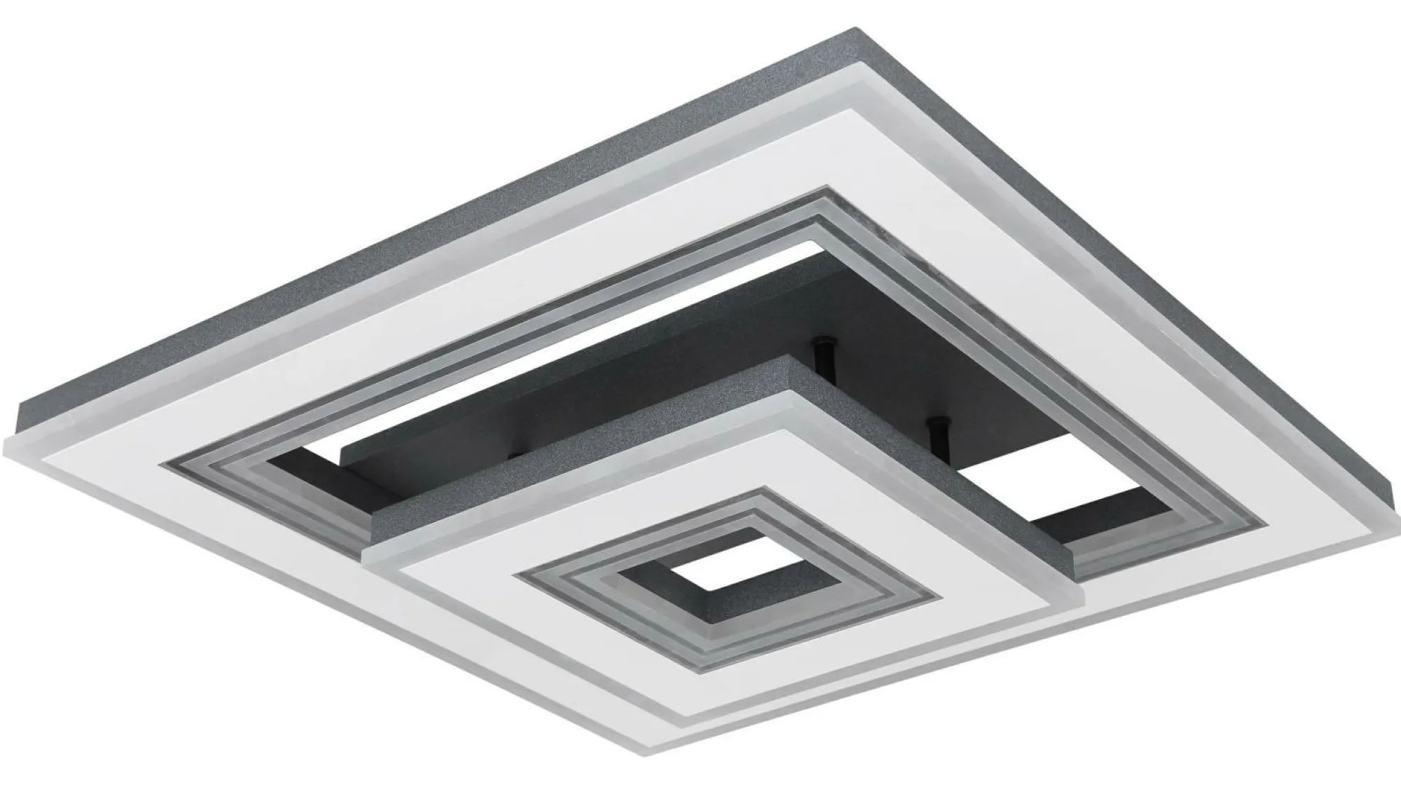 · Diese quadratische Deckenlampe aus der Jack-Serie (50×50 cm) besticht durch ihr stilvolles Design aus schwarzen und weißen Metallrahmen. Sie besteht aus mehreren Rahmen, welche mit opalenem Acryl versehen sind. Die inkludierten LED-Leuchtmittel leisten 2420 Lumen starkes Licht, wobei Sie die Lichtfarbe mithilfe der mitgelieferten Fernbedienung in mehreren Stufen zwischen warm- und kaltweiß (2700 bis 6000 Kelvin) einstellen können. Mit dieser können Sie die Deckenleuchte zudem dimmen und verfügen über eine Nachtlichtfunktion. Durch weitere Modelle der gleichen Serie können Sie das Gesamtbild in Ihren vier Wänden komplettieren und für ein stilvolles Ambiente sorgen.