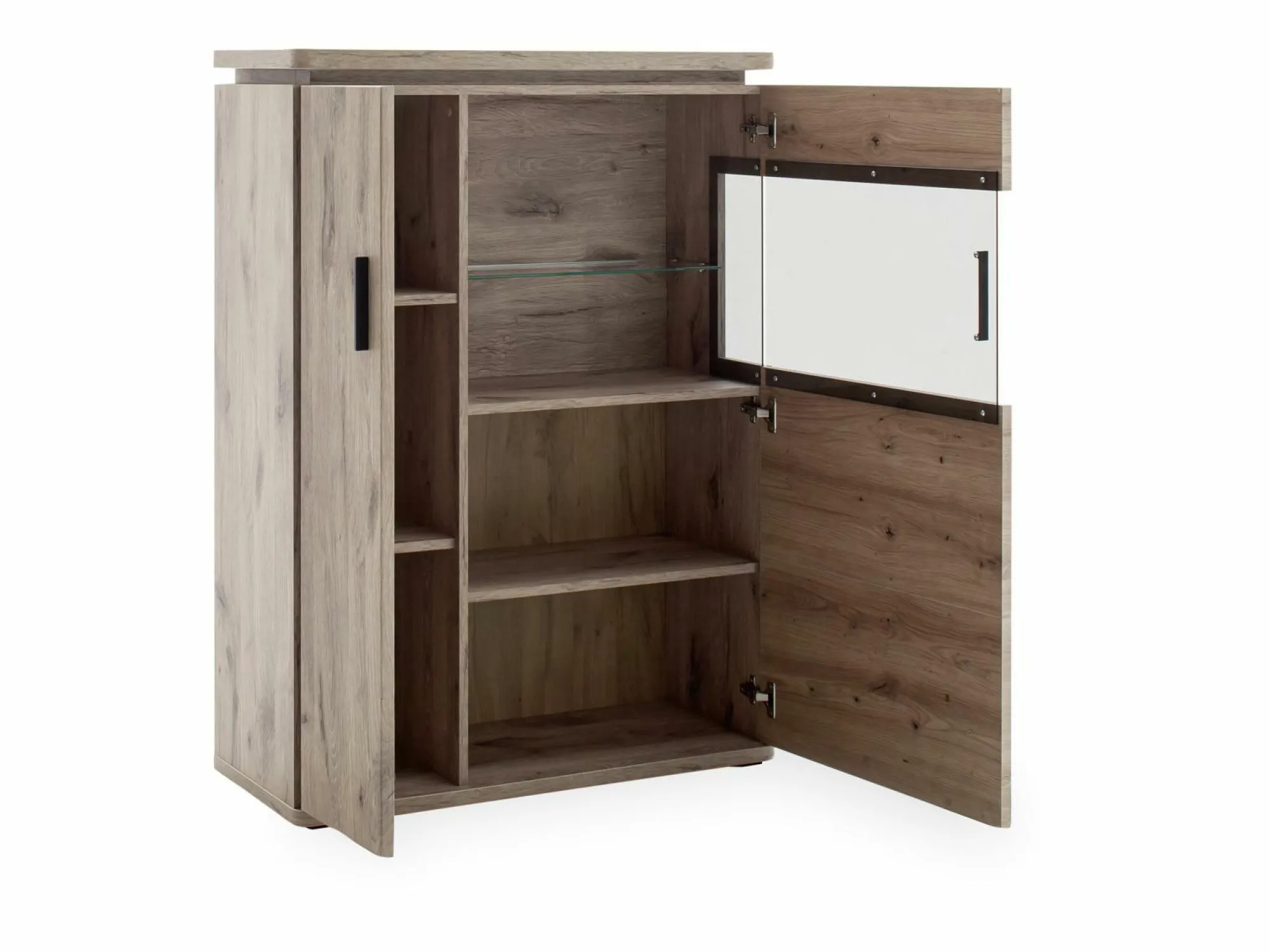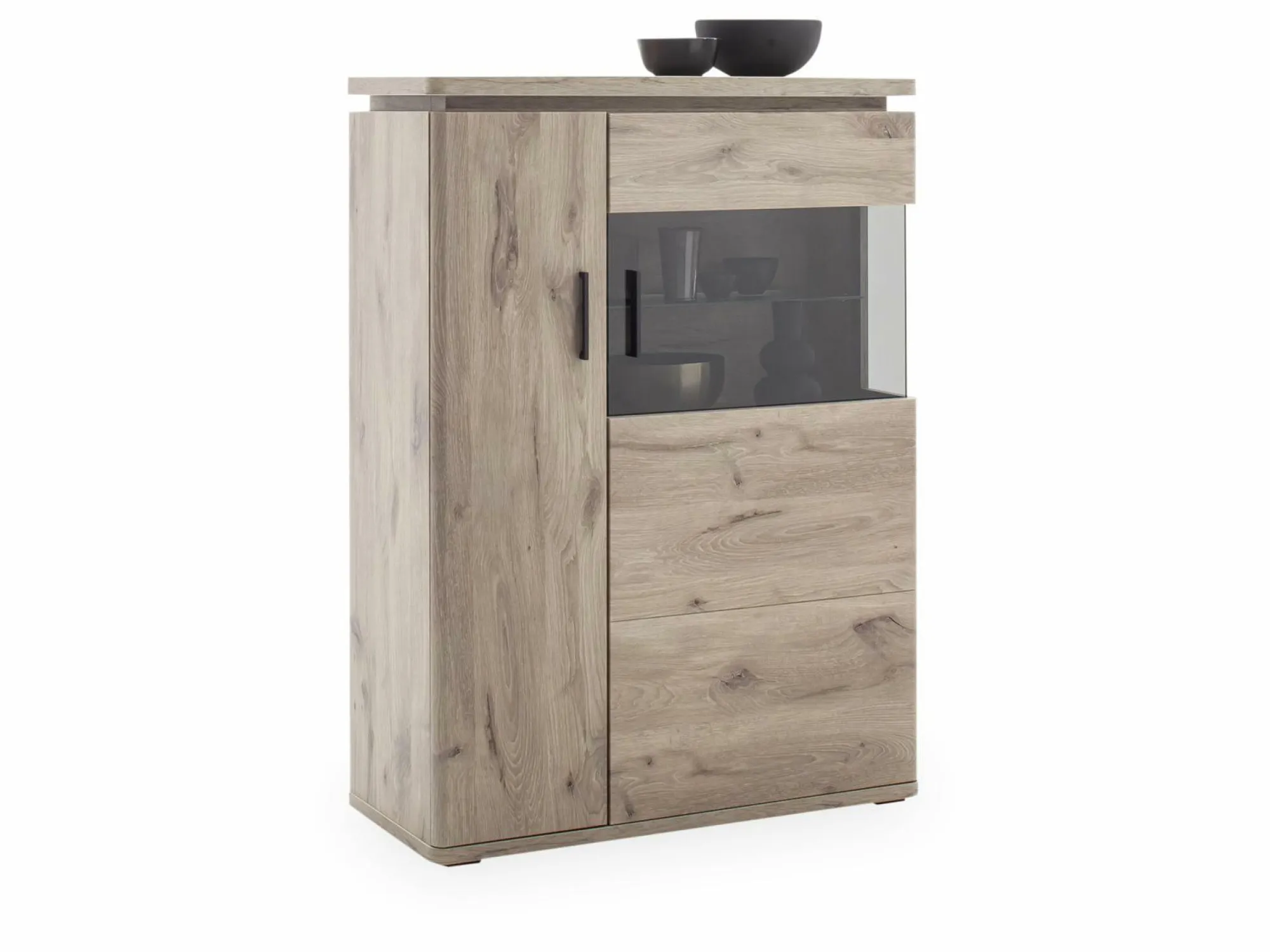 Das Highboard MARSEILLE der Trendmarke HARPER überzeugt mit einem modernen und zugleich zeitlosen Design und einer vielseitigen Stauraumlösung. Das Highboard verfügt über eine Holztür und eine Glastür aus grauem Parsolglas mit edler Seitenverglasung und anthrazitfarbigen Metallgriffen. Der Korpus und die Front erscheinen in robustem Dekor in der Ausführung Viking Oak. Die innenliegenden Böden sind aus Viking Oak Dekor gefertigt, die sichtbaren Glasböden erscheinen in hochwertigem Klarglas. Die sichtbare Rückwand begeistert in der Ausführung Viking Oak Dekor in sandgestrahlter 3D Eichenholzoptik. Eine stimmungsvolle LED Beleuchtung des Oberbodens ist inklusive. Auf Wunsch sind weitere Beleuchtungsmöglichkeiten und eine Funkfernbedienung erhältlich.