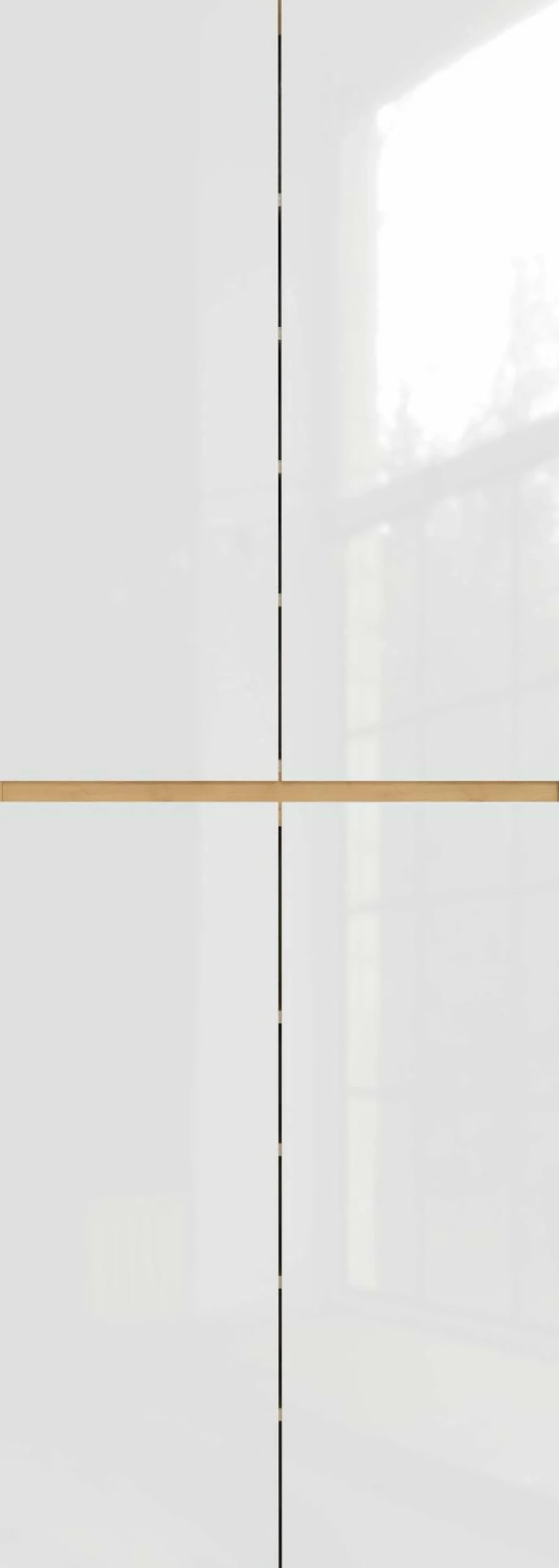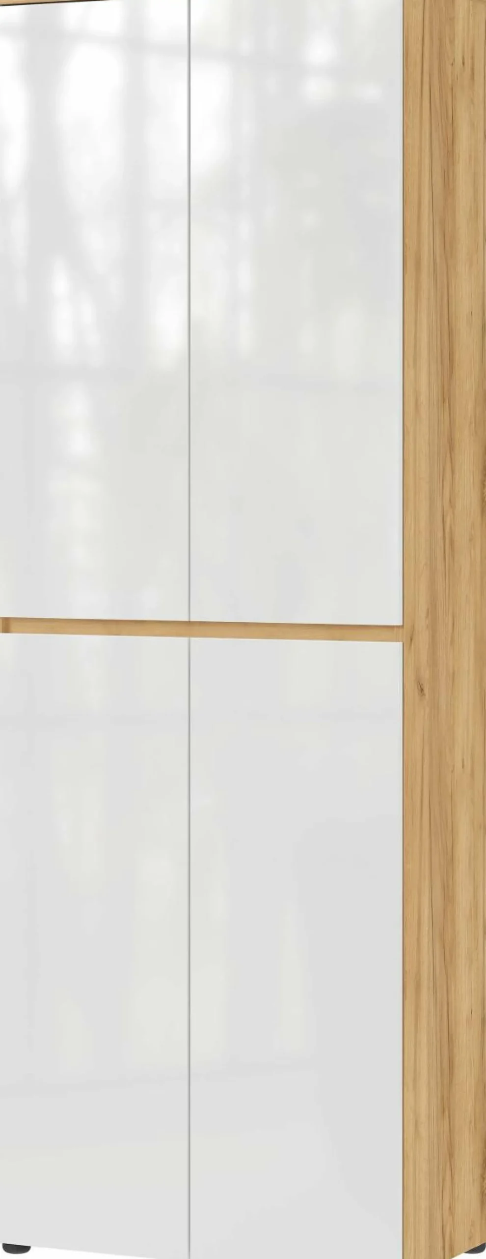 · Mehrzweckschrank mit vier Türen, dahinter ein fester Boden (belastbar bis zu 20 kg) und acht verstellbare Einlegeböden (jeweils belastbar bis zu 10 kg), Unterboden belastbar bis zu 15 kg, Korpus Navarra-Eiche-Nb., Türen in Weiß, fünf schwarze Möbelgleiter aus Kunststoff, Melaminharzbeschichtung, hochwertige ABS-Kanten, Türen Lack Hochglanz, griffloses Design, Türdämpfung, Made in Germany.