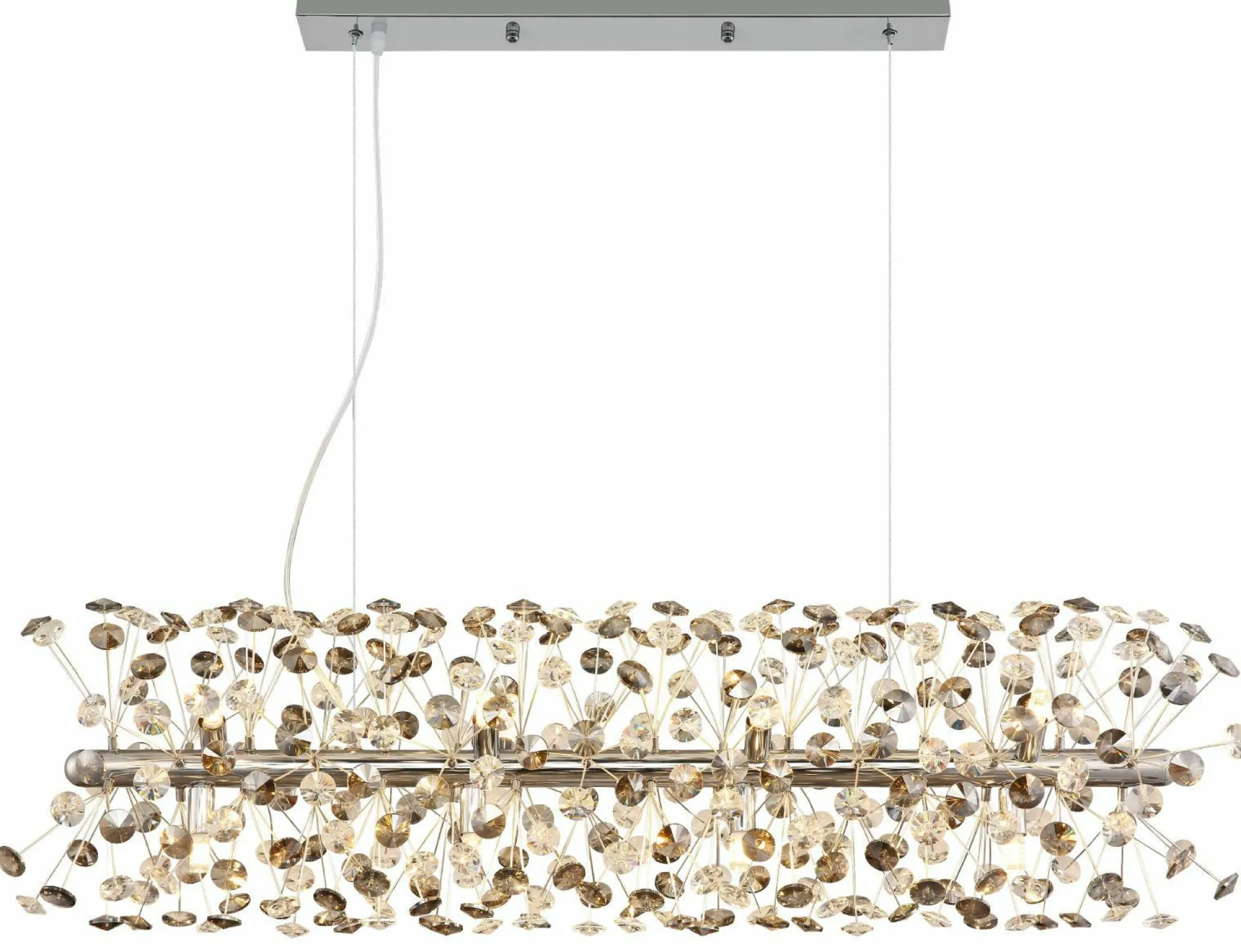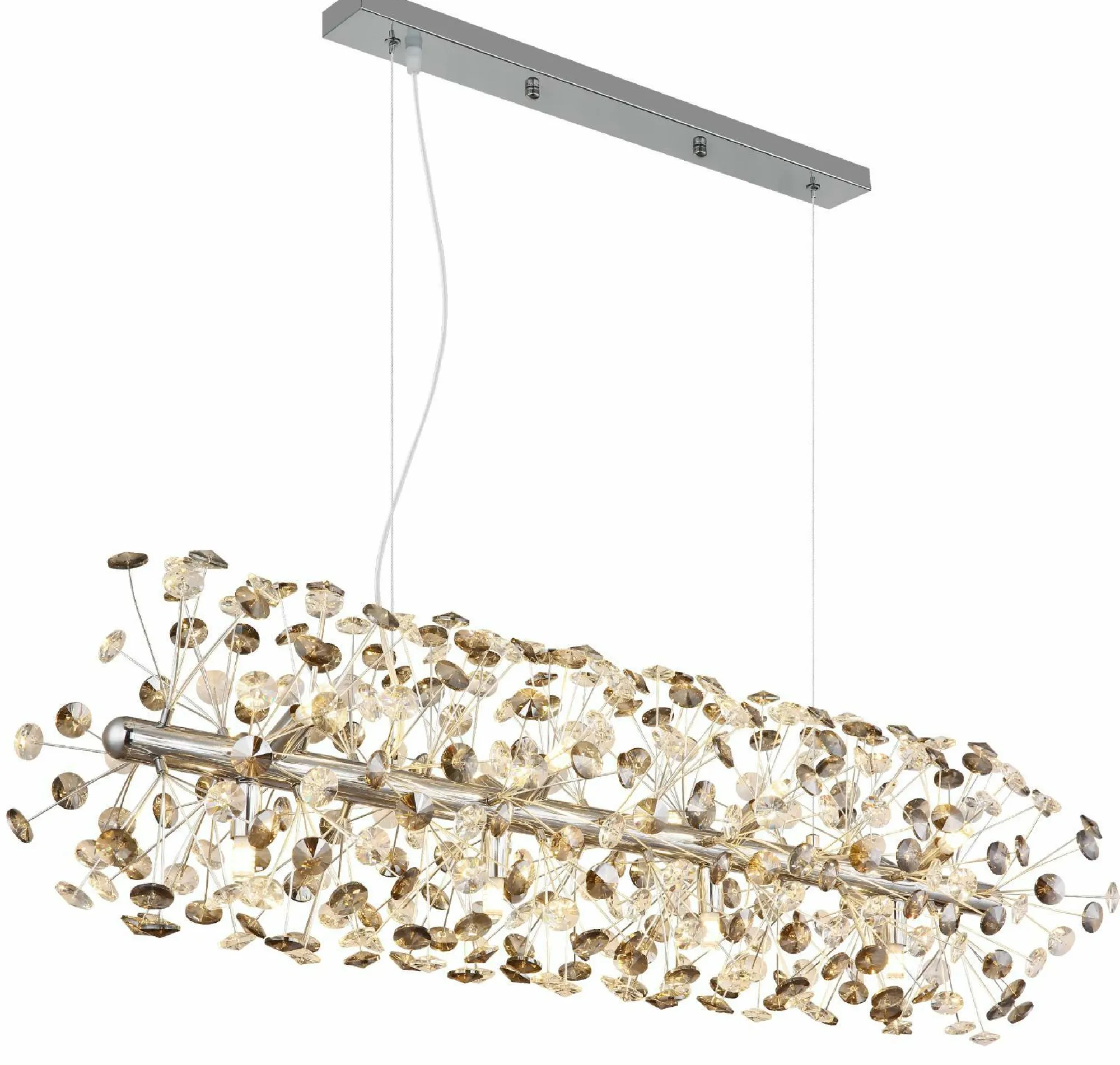 Setzen Sie mit dieser formschönen Hängeleuchte tolle Lichtakzente und verleihen Sie Ihrem Interieur eine besondere Note. Bringen Sie mit der Lampe die GLOBO-Lighting-Markenqualität in Ihre vier Wände. Durch das hübsche Design harmoniert die Lampe mit beinahe jedem Einrichtungsstil und ist eine Bereicherung für jedes Zimmer. Sie ist 30 Zentimeter breit, besitzt eine Länge von 90 Zentimetern und hat eine Gesamthöhe von 150 Zentimetern. Die Leuchte kommt mit einer G9-Fassung. Sie wird sich perfekt in Ihre Wohneinrichtung integrieren und sorgt dort für ein persönliches Flair. Um das Konzept Ihres Raumes gelungen abzurunden, eignet sich die Hängeleuchte aus Metall ausgezeichnet. Sie erfüllt auch ausgeschaltet eine dekorative Funktion.