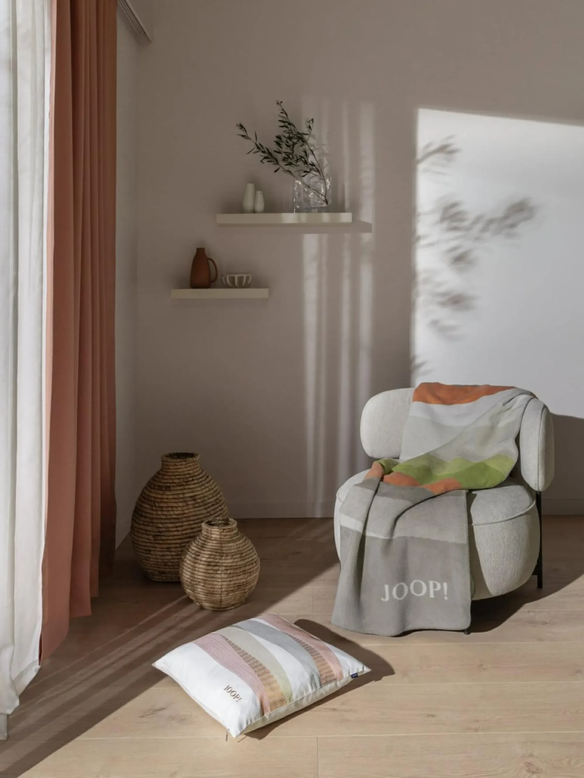· Blickdichter Fertigvorhang mit verdeckten Schlaufenband, gewebt, einfarbig, matte Flanelloptik mit aufgenähtem JOOP! Ripsband oben rechts als Blickfang