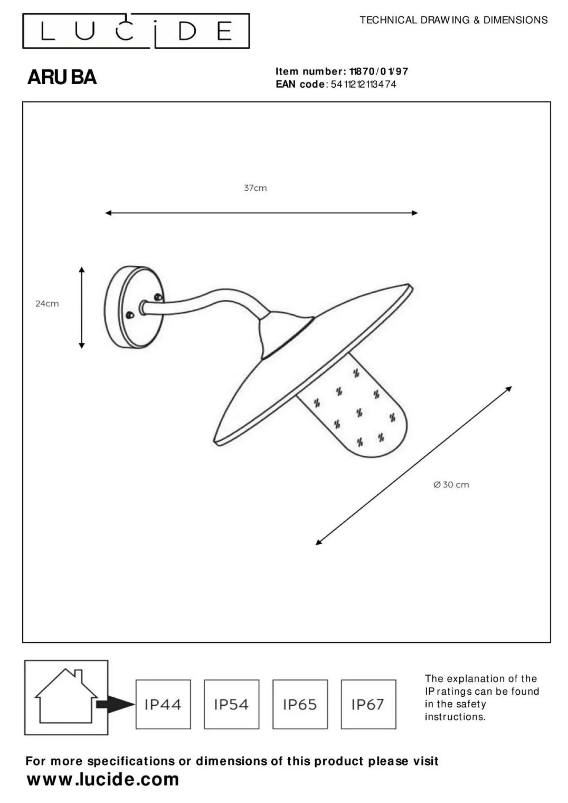 Mit Sicherheit findet diese hübsche Wandleuchte einen schönen Ort, an dem sie Ihr Interieur erhellen kann. Das Modell ARUBA ist mit der Schutzart IP44 versehen und infolgedessen vor Eindringen fester Fremdkörper mit einem Durchmesser größer als 1 Millimeter und Spritzwasser gesichert. Es setzt mit seinem tollen Aussehen ein dekoratives Statement und bereichert dadurch jedes Einrichtung. In dieser Leuchte sind alle Qualitäten und Besonderheiten, die die Marke LUCiDE ausmachen, vereint. Das Modell ARUBA verfügt über eine Dimmfunktion, mit der Sie die Helligkeit Ihren Wünschen anpassen können. Die Leuchte im ländlichen Design besticht mit der Qualität des verwendeten Metalls. Sie besitzt ein Breitenmaß von insgesamt 37 Zentimetern, eine Höhe von 24 Zentimetern und eine Länge von 30 Zentimetern. Das Modell ARUBA integriert sich gelungen in jedes Zimmer und schafft ein schönes Ambiente. Die Leuchte kann mit Leuchtmitteln mit einem E27-Sockel bestückt werden. Um das Konzept jeglicher Wohnräume stimmig zu ergänzen, eignet sie sich grandios. Auf diese Wandlampe werden Sie nicht verzichten wollen.