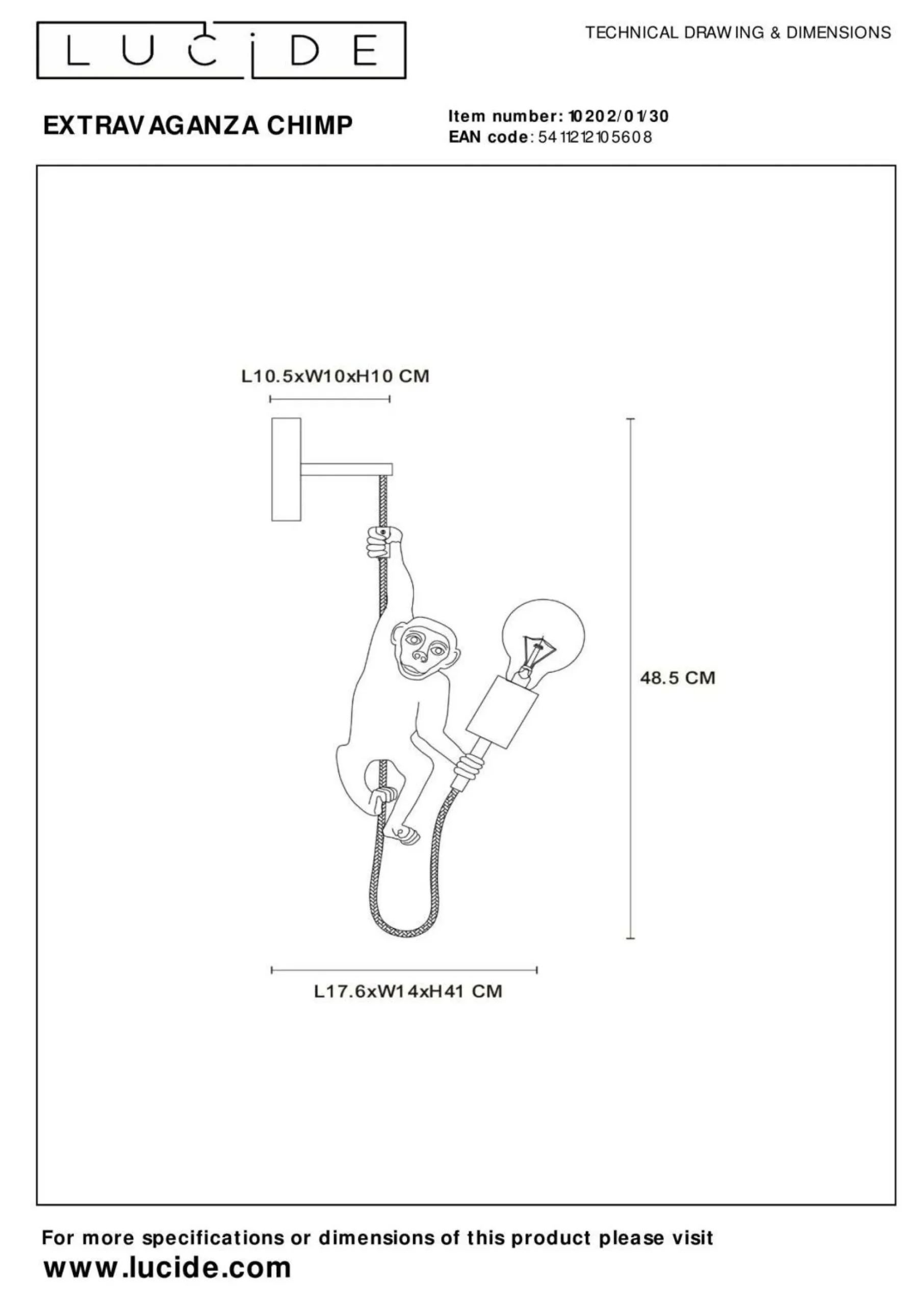· Diese tierische Wandleuchte ist eine originelle Ergänzung für Ihr Interieur. Die neueste Ergänzung der Extravaganza-Reihe. Der verspielte Schimpanse zieht sofort alle Aufmerksamkeit auf sich. Extravaganza Chimp ist aus hochwertigem Kunststoff gefertigt, so dass Sie keine extra Bananen kaufen müssen. Wie ein echter Akrobat baumelt der Chimp von der Wand und hält in der einen Hand die Lichtquelle und in der anderen den Schalter. Die Wandleuchte hat eine Höhe von 48,5 Zentimetern und kann perfekt gedimmt worden. So schaffen Sie in Ihrem Dschungel auch am Abend die richtige Atmosphäre.