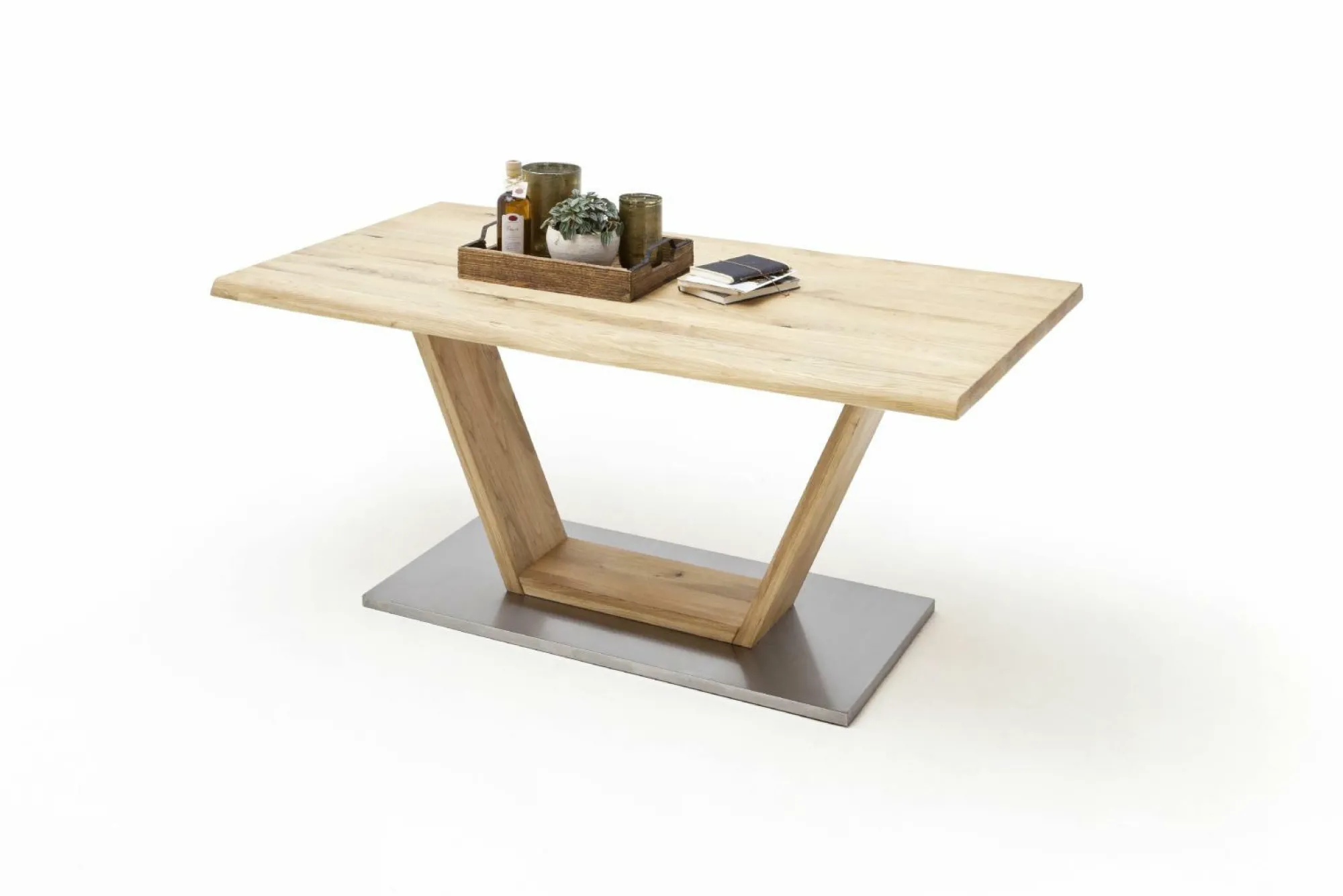 Esstisch Greta 2 von MCA furniture bietet Platz zum gemeinsamen Essen in Ihrem Wohnbereich. Der hochwertige Tisch besteht aus einer Tischplatte aus massiver, geölter Balkeneiche mit Baumkante. Abgerundet wird die Platte von einem V-Fuß mit Fußplatte aus ummantelten Echtmetall. Dadurch erhält der Tisch einen stabilen Stand und zugleich einen modernen Look.