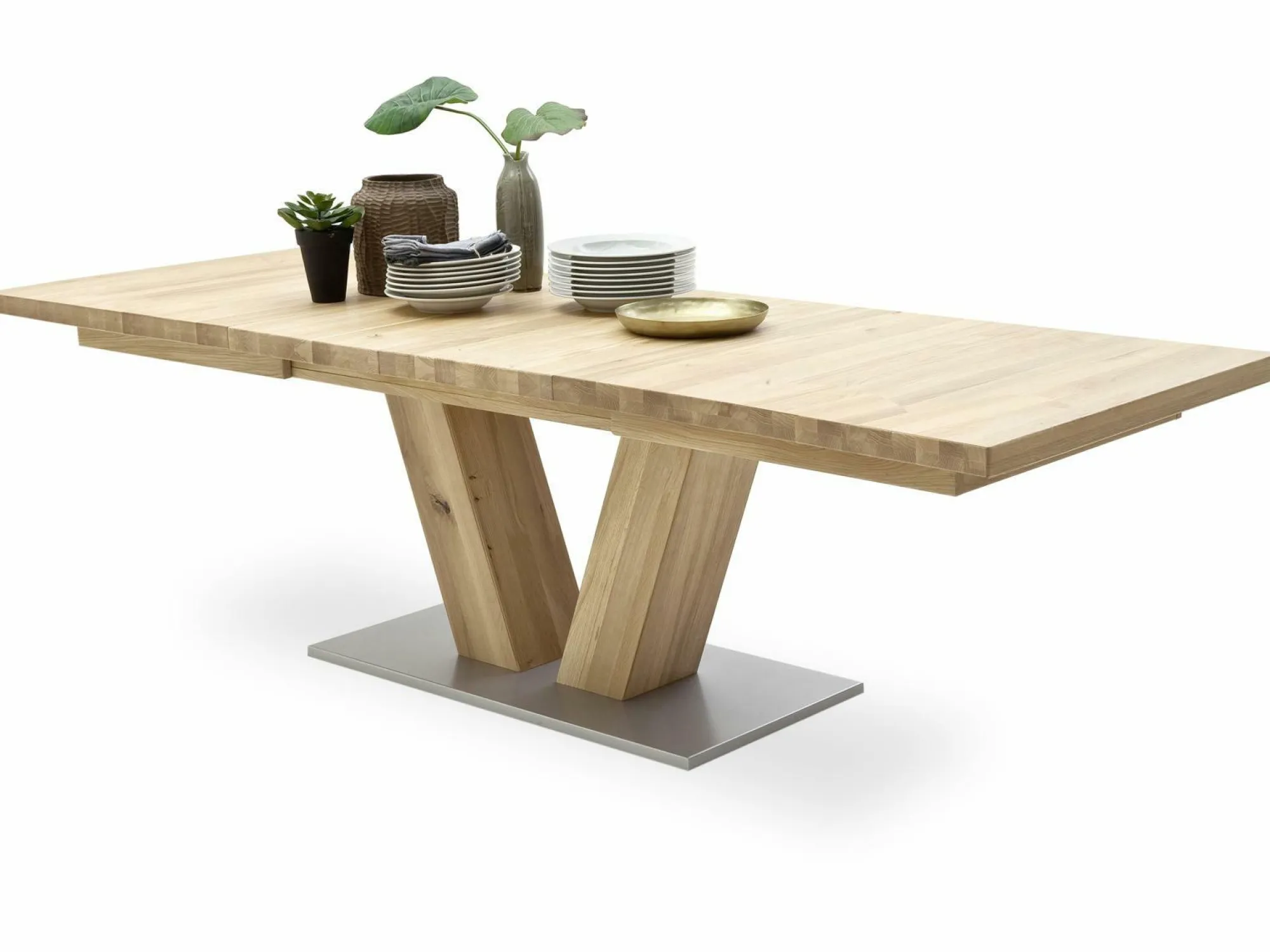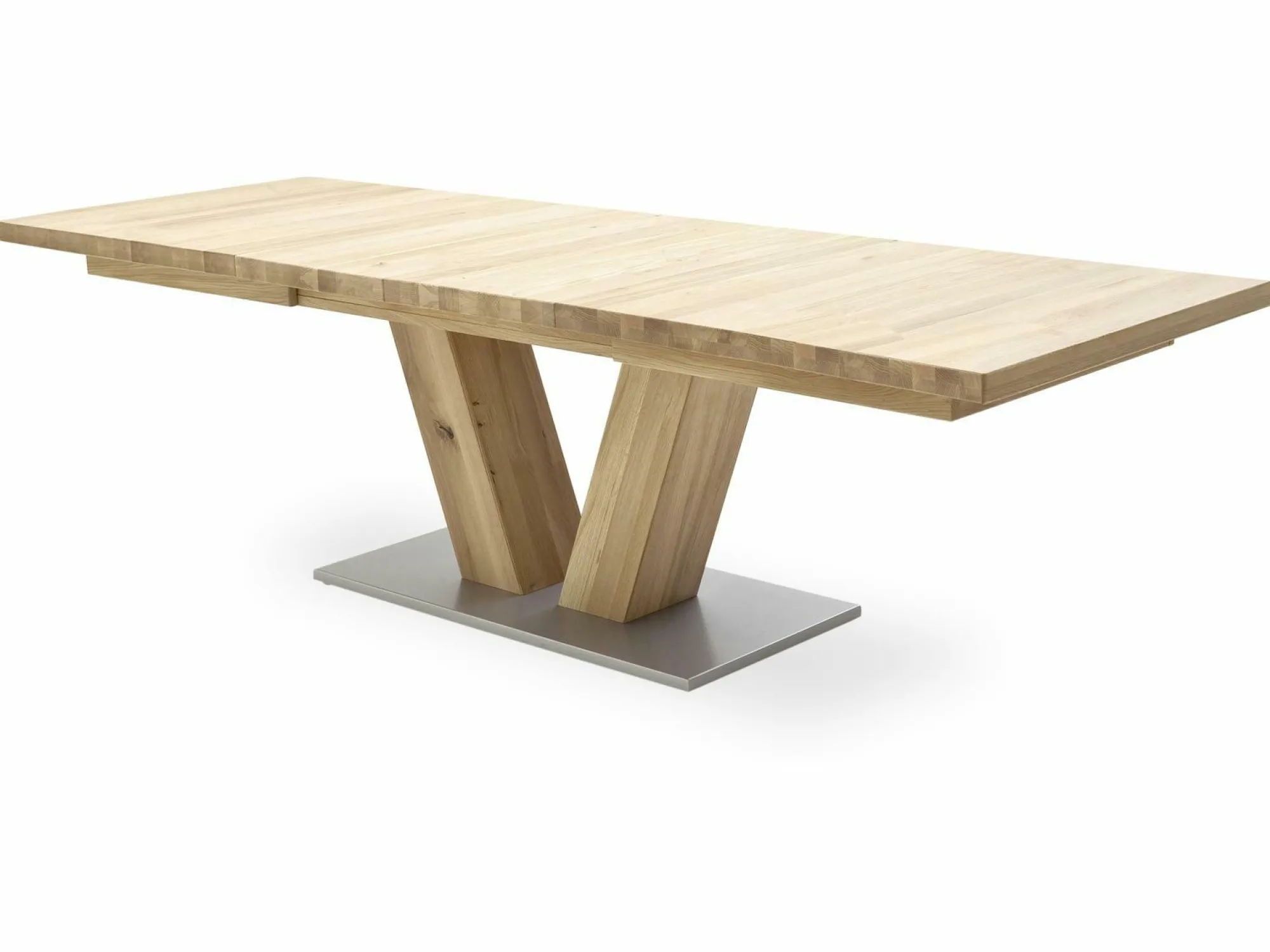 Eine besondere Form und tolles Material – der Esstisch Managua A überzeugt auf ganzer Linie! Insgesamt besteht der Tisch aus geölter Eiche Bianco massiv und präsentiert dadurch einen natürlichen, aber auch modernen Stil. Durch seine kantige Form und die beiden speziellen Tischbeine wird er in Ihrem Esszimmer zum Hingucker. Dabei ist der Tisch 140 cm breit und kann sogar nach Bedarf auf 220 cm ausgezogen werden. Nehmen Sie mit Ihren Liebsten Platz und genießen Sie leckere Mahlzeiten!