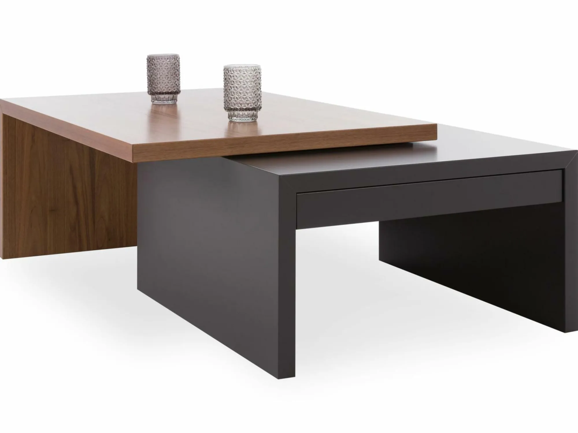 Mit dem Couchtisch Alicante aus dem Hause Mondo bringen Sie ein stilvolles Element in Ihren Wohnraum. Der Tisch besteht aus einem Grundtisch in Graphit sowie einer L-förmigen Tischplatte in Nussbaum. Die auf dem Grundtisch aufliegende Tischplatte ist verschieb- und drehbar und lässt sich ganz nach Ihren Wünschen ausrichten. Für zusätzlichen Komfort sorgt der integrierte Schubkasten.