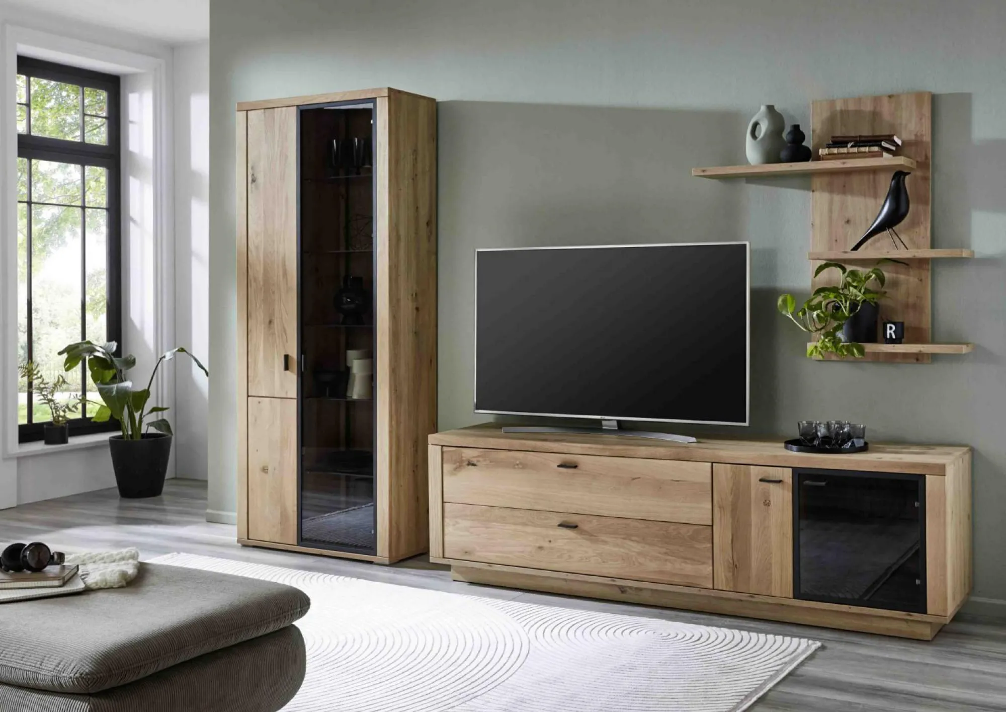· Lowboard mit zwei Schubkästen links, einer Glastür und einer Holztür