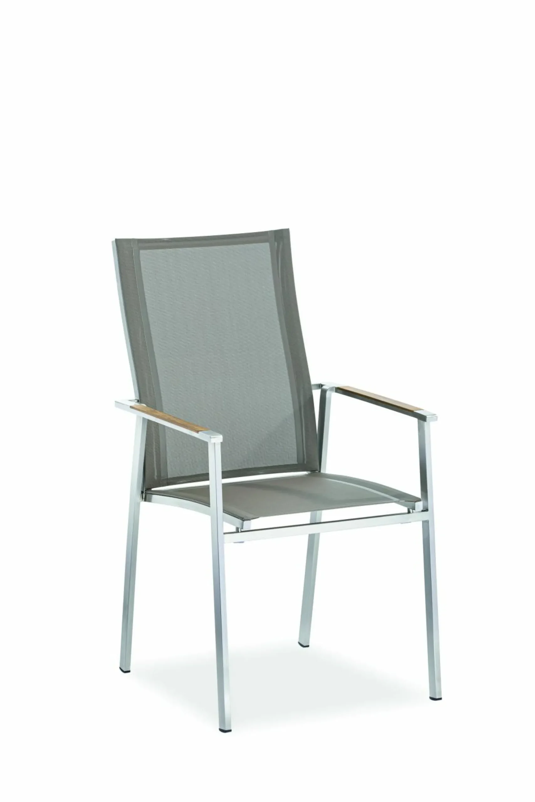 · Hochlehner SCALEA Sitz und Rücken in Textilen, Armlehnauflagen Teak natur, Gestell Edelstahl gebürstet, stapelbar, 57×64 / 100 cm