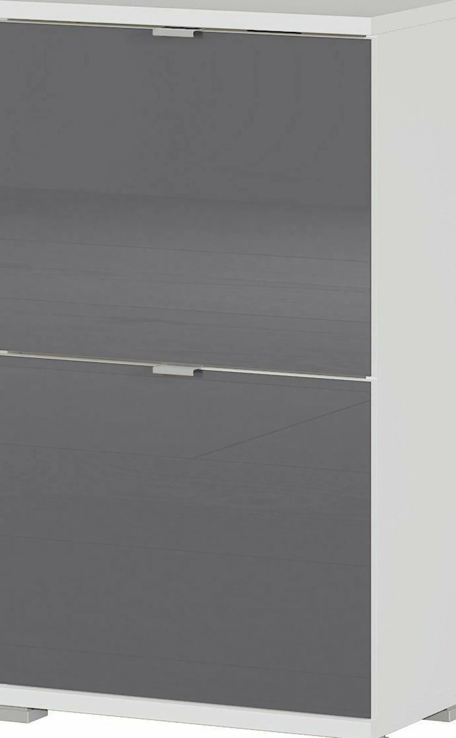 · Set bestehend aus einem Schuhschrank (Korpus) und zwei Klappen, Korpus in Weiß, Fronten in Graphit, zwei Kantengriffe aus Metall und vier Füße aus Kunststoff in Silber, Fronten melaminharzbeschichtet mit Glasauflage, Platz für bis zu 8 Paar Schuhe, hochwertige ABS-Kanten, Türdämpfung, Metallschuhkörbe, Made in Germany.