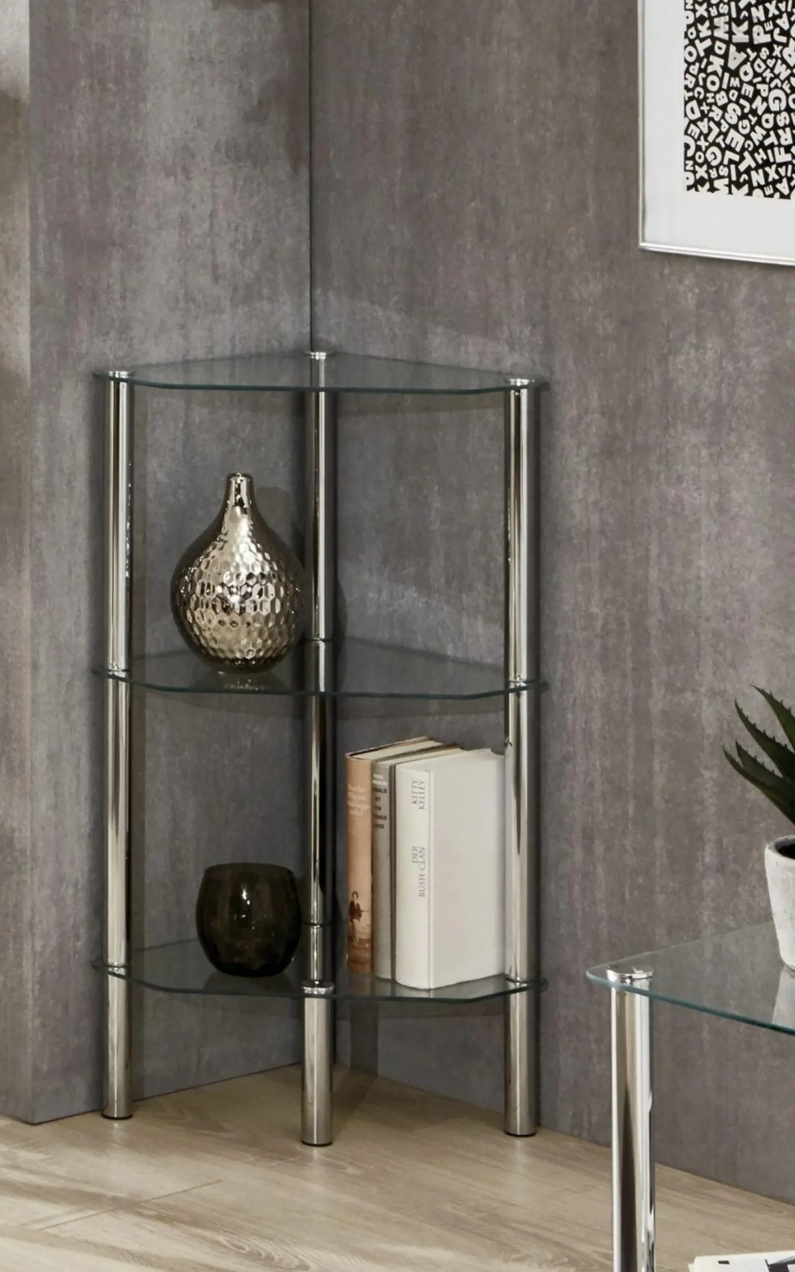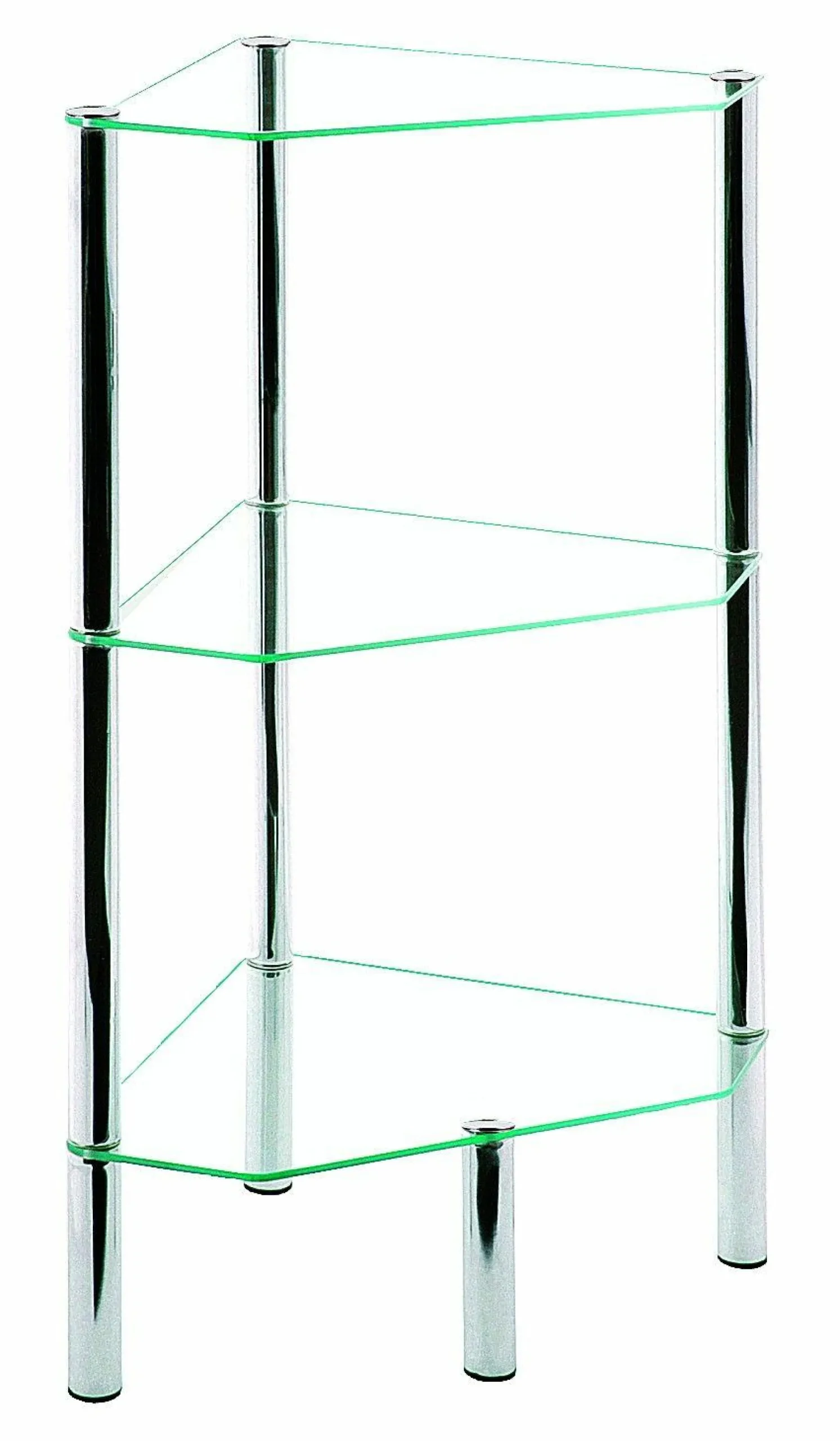 Schaffen Sie eine praktische und zugleich hochwertige Möglichkeit zum Verstauen von Gegenständen mit diesem Regal. Das Regal verfügt über drei eckige Ablagen aus Sicherheitsglas, während das Gestell aus verchromtem Stahlrohr besteht und somit einen stilvollen Kontrast bietet und die moderne Optik des Regals unterstreicht.