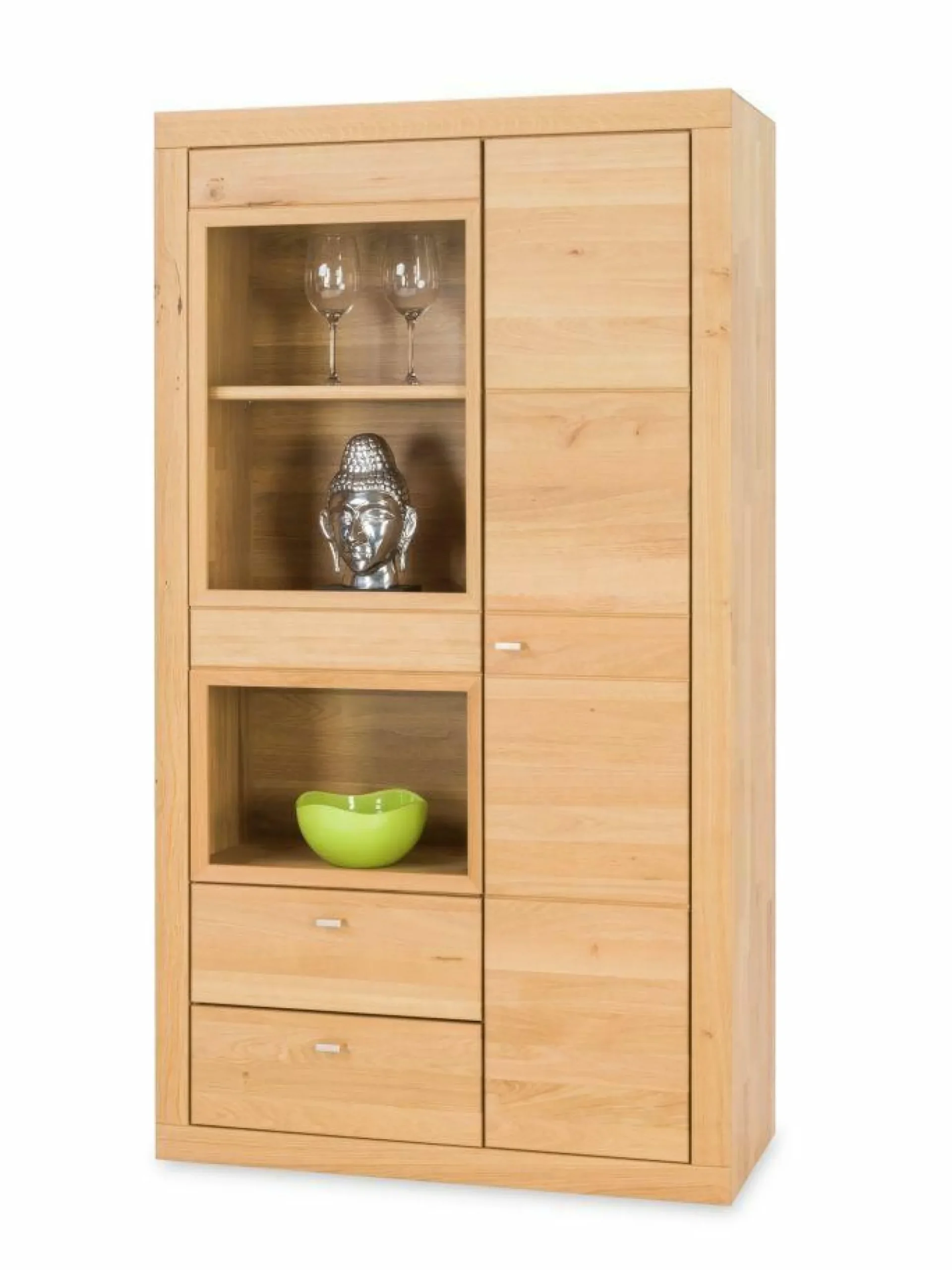 3 offene Fächer links mit 1 Holzboden 1 Holztür rechts mit 3 Holzböden 2 Schubkästen unten links Europ. Wildeiche massiv, soft gebürstet . >>> Preis ohne Beleuchtung, Trafo und ohne Funkfernsteuerung <<<, Aurum
