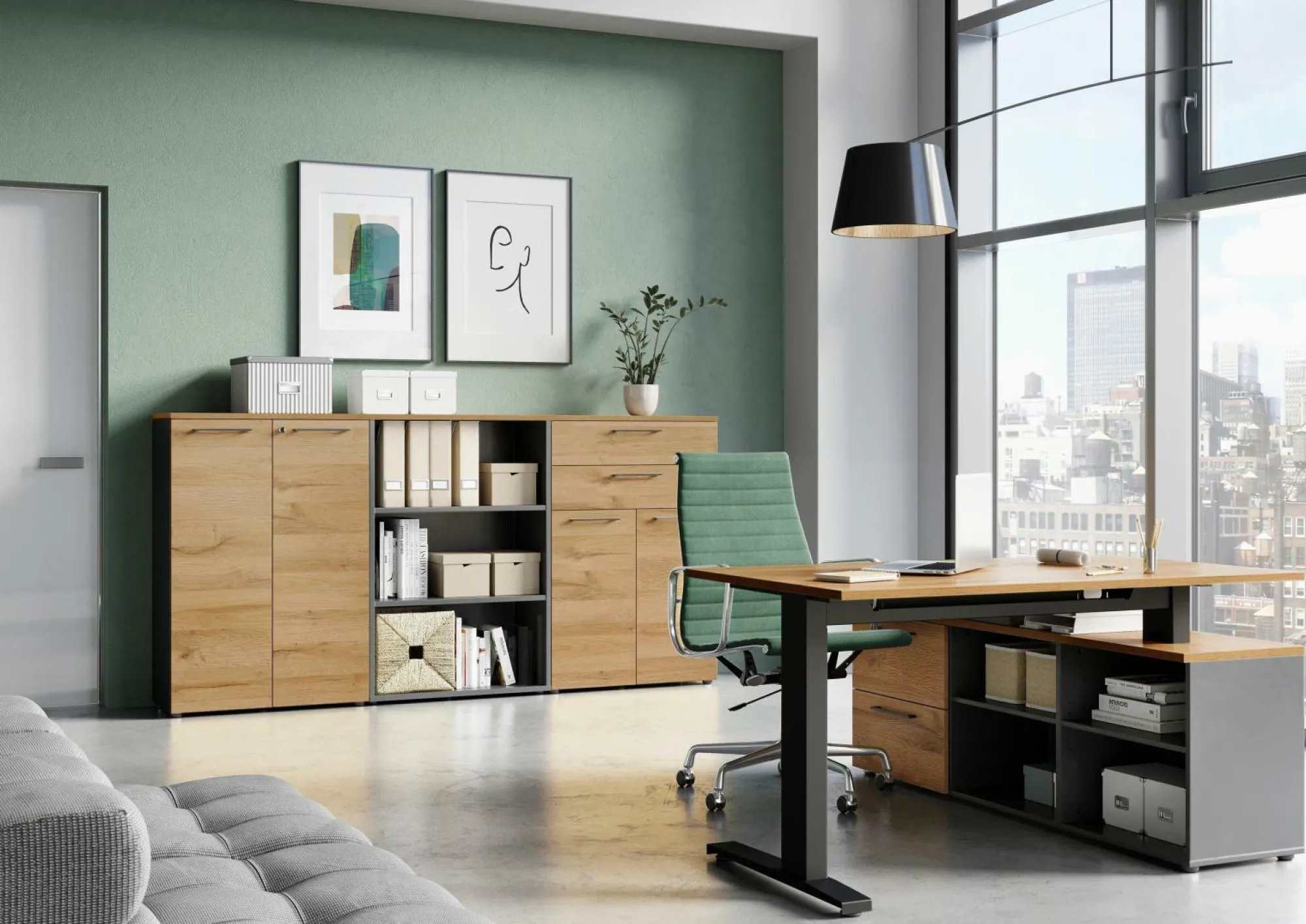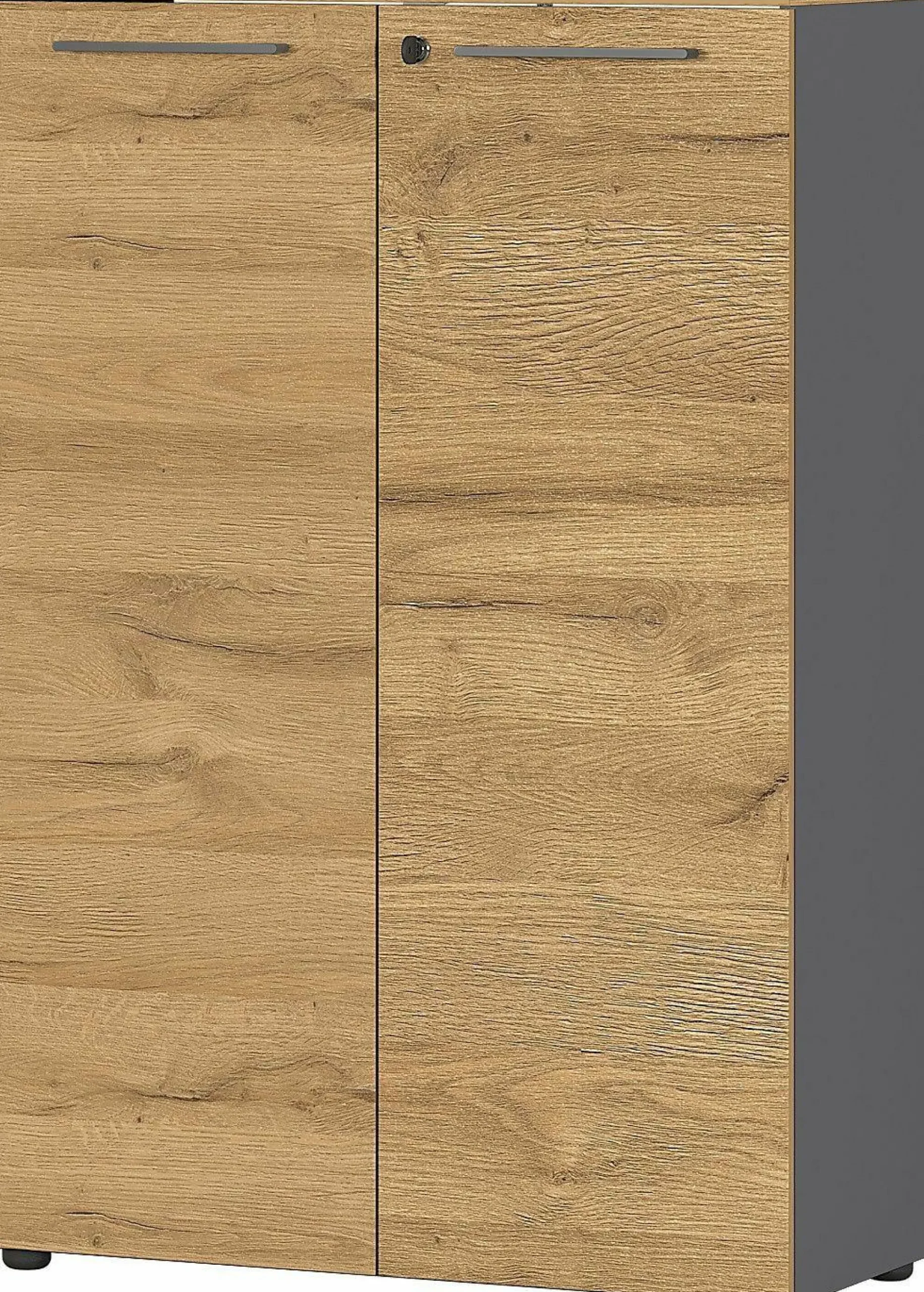 · Aktenschrank mit zwei abschließbaren Türen, dahinter zwei verstellbare Einlegeböden (jeweils mit bis zu 10 kg belastbar), Oberboden bis zu 10 kg und Unterboden mit bis zu 30 kg belastbar, zwei Bügelgriffe aus Metall in Graphit, fünf schwarze Möbelgleiter, Melaminharzbeschichtung, ABS-Kanten, Türdämpfung, Made in Germany.