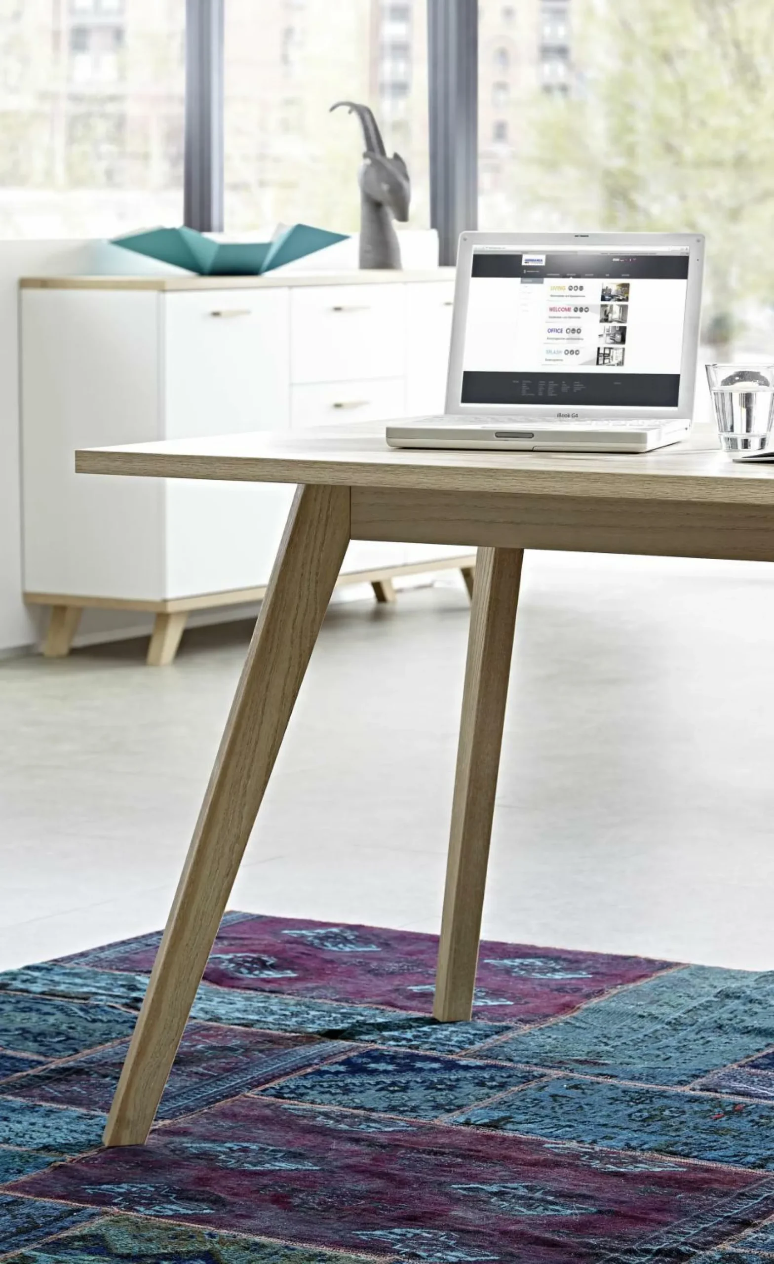 · Schreibtisch mit integriertem Sideboard, Sideboard mit drei Schubkästen mit Selbsteinzug (jeweils belastbar bis zu 4,5 kg) und zwei offenen Fächern mit je einem verstellbaren Einlegeboden (jeweils belastbar bis zu 9,5 kg), sodass vier Fächer entstehen, Oberboden belastbar bis zu 34 kg, Unterboden belastbar bis zu 9,5 kg, vier Füße und ein Stützfuß MDF-ummantelt, auf dem Sideboard aufliegend eine Schreibtischplatte (belastbar bis zu 50 kg) mit zwei Füßen, Füße und Griffe aus Massivholz, Ober- und Unterboden sowie Schreibtischplatte in Sanremo-Eiche-Nb., der Rest in Weiß, Fronten MDF-tiefgezogen, supermatte Fronten, hochwertige ABS-Kanten, Made in Germany.