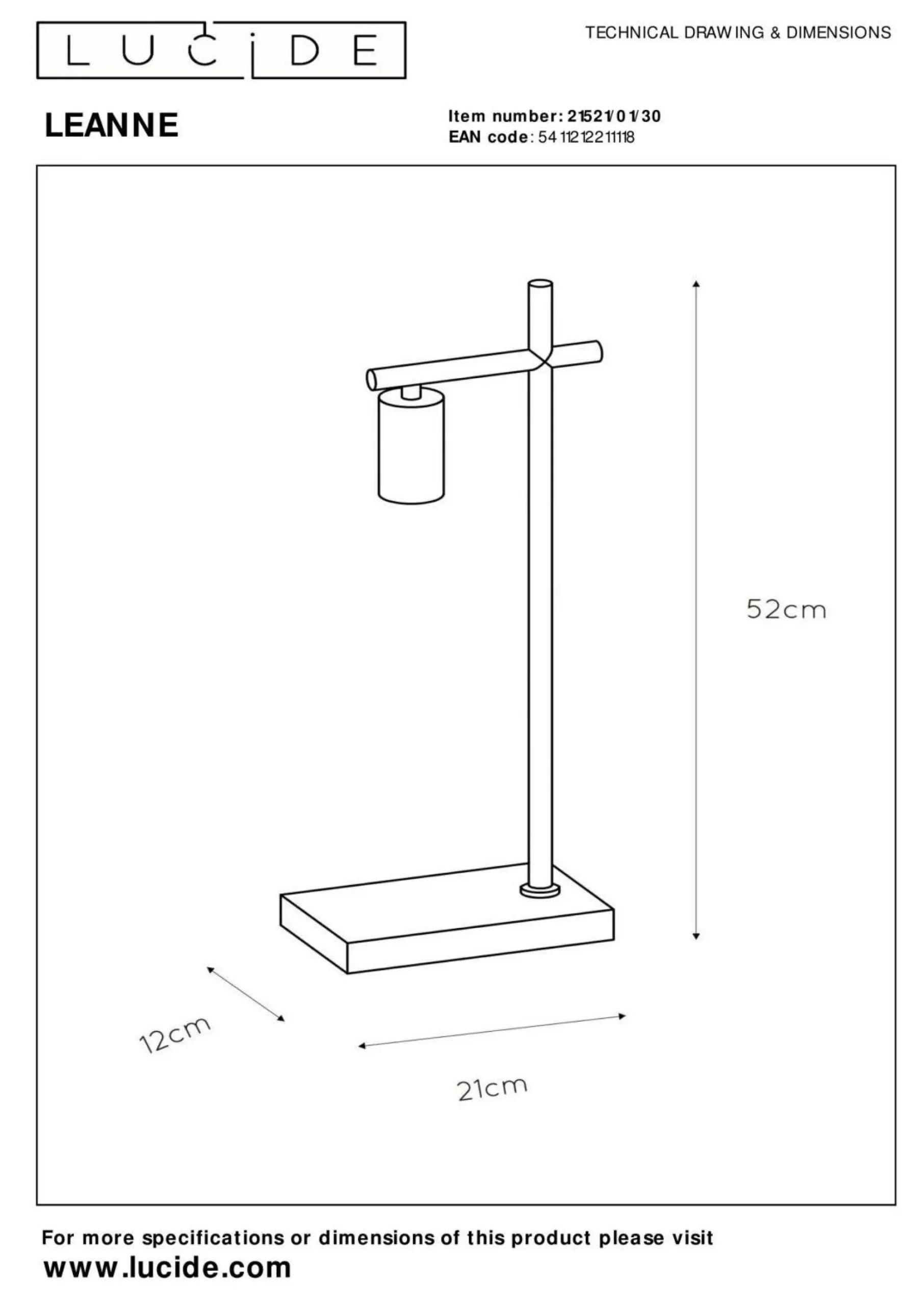Bereichern Sie Ihre vier Wände mit dieser geschmackvollen Lampe. Lassen Sie sich von der hohen Qualität und dem durchdachten Design der Marke LUCiDE überzeugen. Durch ihr stilsicheres Aussehen vervollständigt die Lampe das Einrichtungskonzept jeglicher Wohnräume auf angenehme Art und Weise. Sie besitzt eine Länge von 21 cm, eine Breite von 12 cm sowie eine Höhe von 52 cm. Auch auf die Materialqualität legt der Hersteller besonderen Wert und verwendet für die Tischlampe Metall. Die Leuchte wird jedem Wohnraum einen persönlicheren Touch verleihen, egal, wo sie installiert wird. Sie besitzt eine E27-Fassung. Durch diese Tischlampe wird das Gesamtbild Ihrer Einrichtung bereichert. Die Tischleuchte ist eine hervorragende Ergänzung zu Ihrem Interieur und darf in keinem Zuhause fehlen.