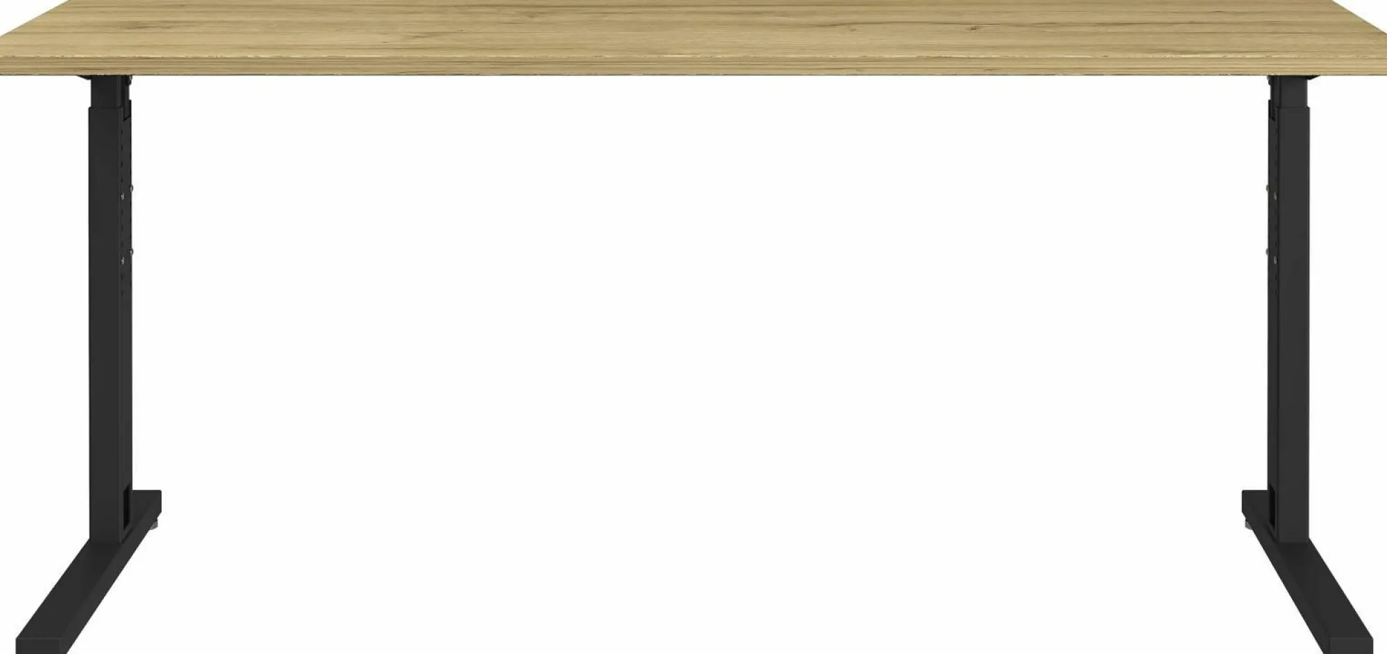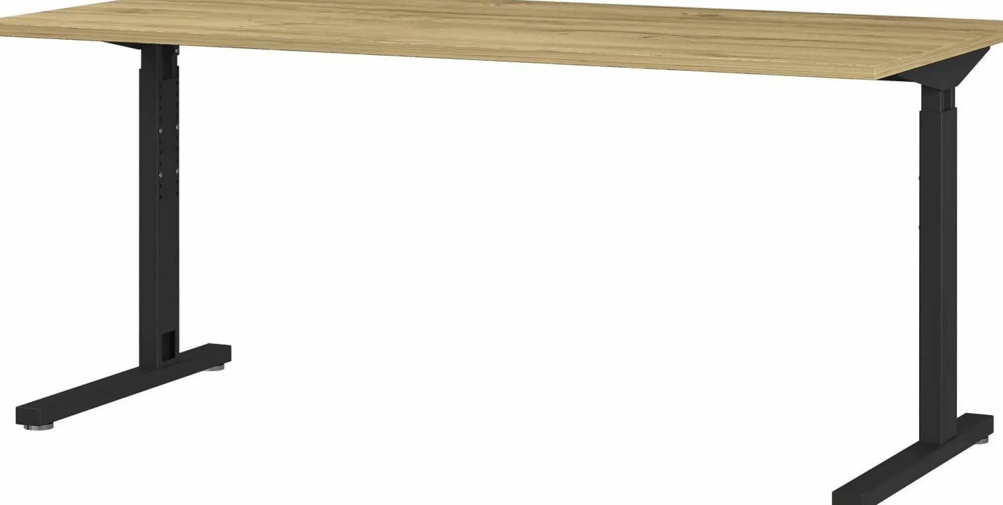 · Mechanisch höheneinstellbarer Schreibtisch mit zwei C-Füßen, Tischplatte (belastbar bis zu 80 kg) Gestell aus pulverbeschichtetem Metall Höhe einstellbar von 70-80 cm, Nivellierbare Gleiter, Melaminharzbeschichtung, hochwertige ABS-Kanten, Made in Germany.