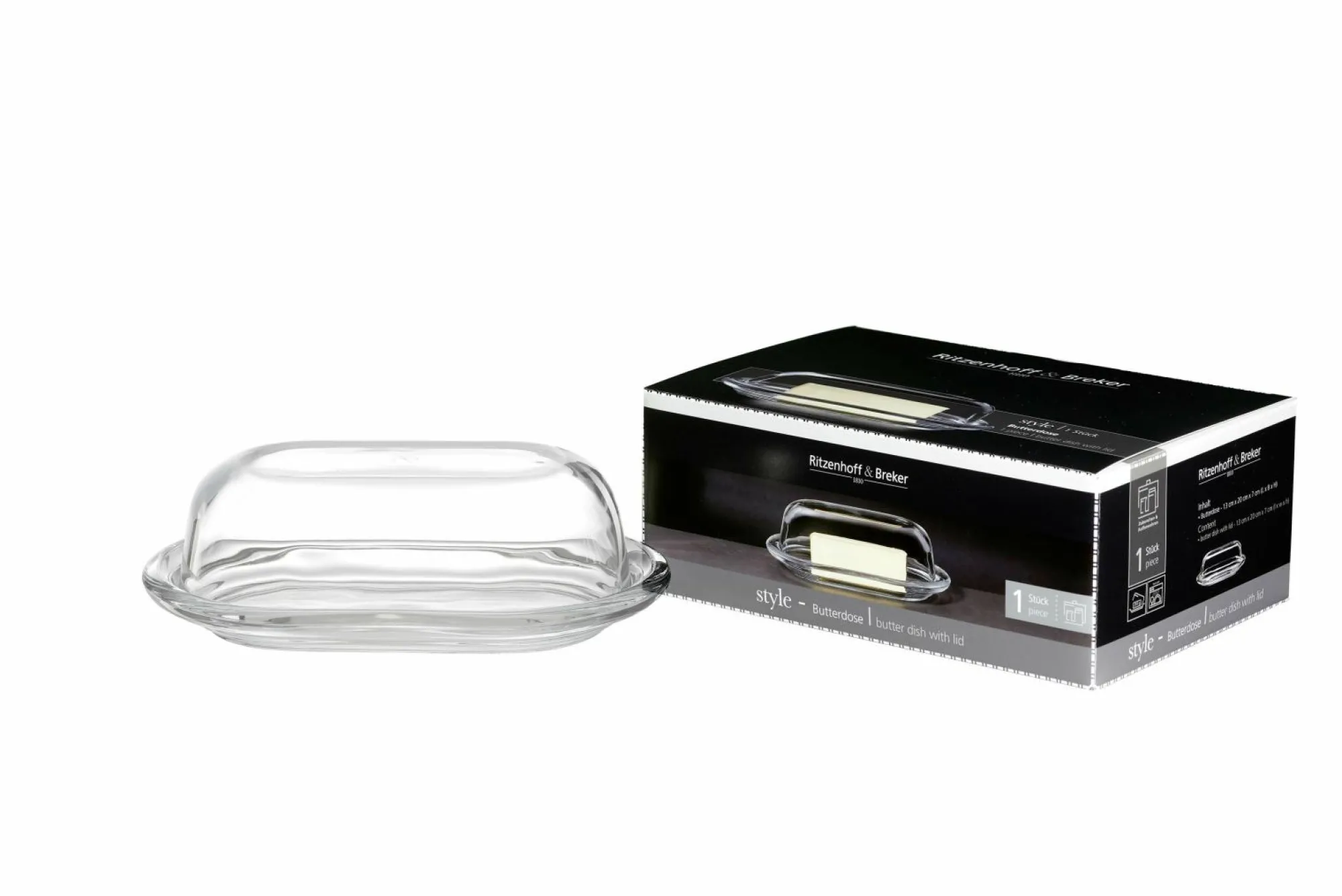 Mit der Butterdose Fresh von Ritzenhoff amp Breker können Sie Ihre Butter besonders geschützt aufbewahren, sodass diese lange frisch und genießbar bleibt. Die Dose besteht aus klarem Glas und wirkt durch ihre Form sehr modern und zeitlos. Durch das Material ist die Butterdose spülmaschinenfest, wodurch eine leichte Reinigung möglich ist. Ob im Alltag oder zum Servieren, wenn Sie Gäste empfangen – die Dose ist durch ihr schickes, dezentes Design überall einsetzbar.