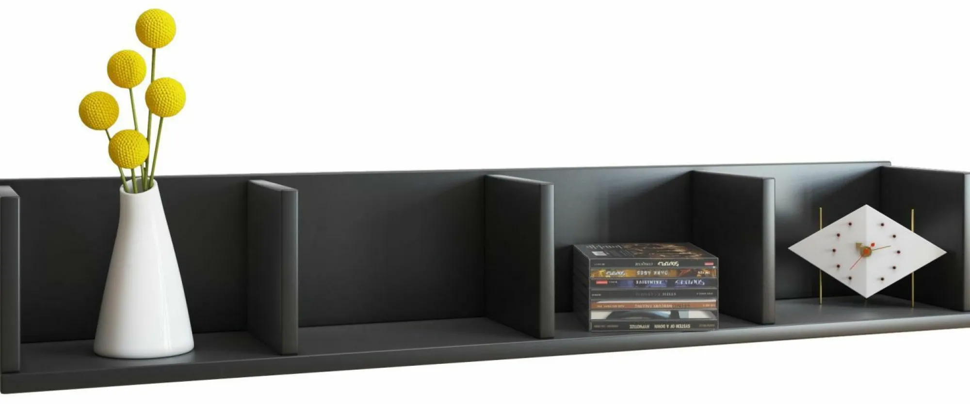 · VCM Wandregal Honsa Schwarz. Für Sammelschätze wie z.B. CDs, DVDs und Bücher. Holzstruktur-Nachbildung. 3 variable Einlegeböden mit 4 Fächern. Die Lieferung erfolgt zerlegt inkl. Montageanleitung und Montagematerial. Produktmaße : Höhe 15 x Breite 97 x Tiefe 17 cm Farbe: Schwarz
