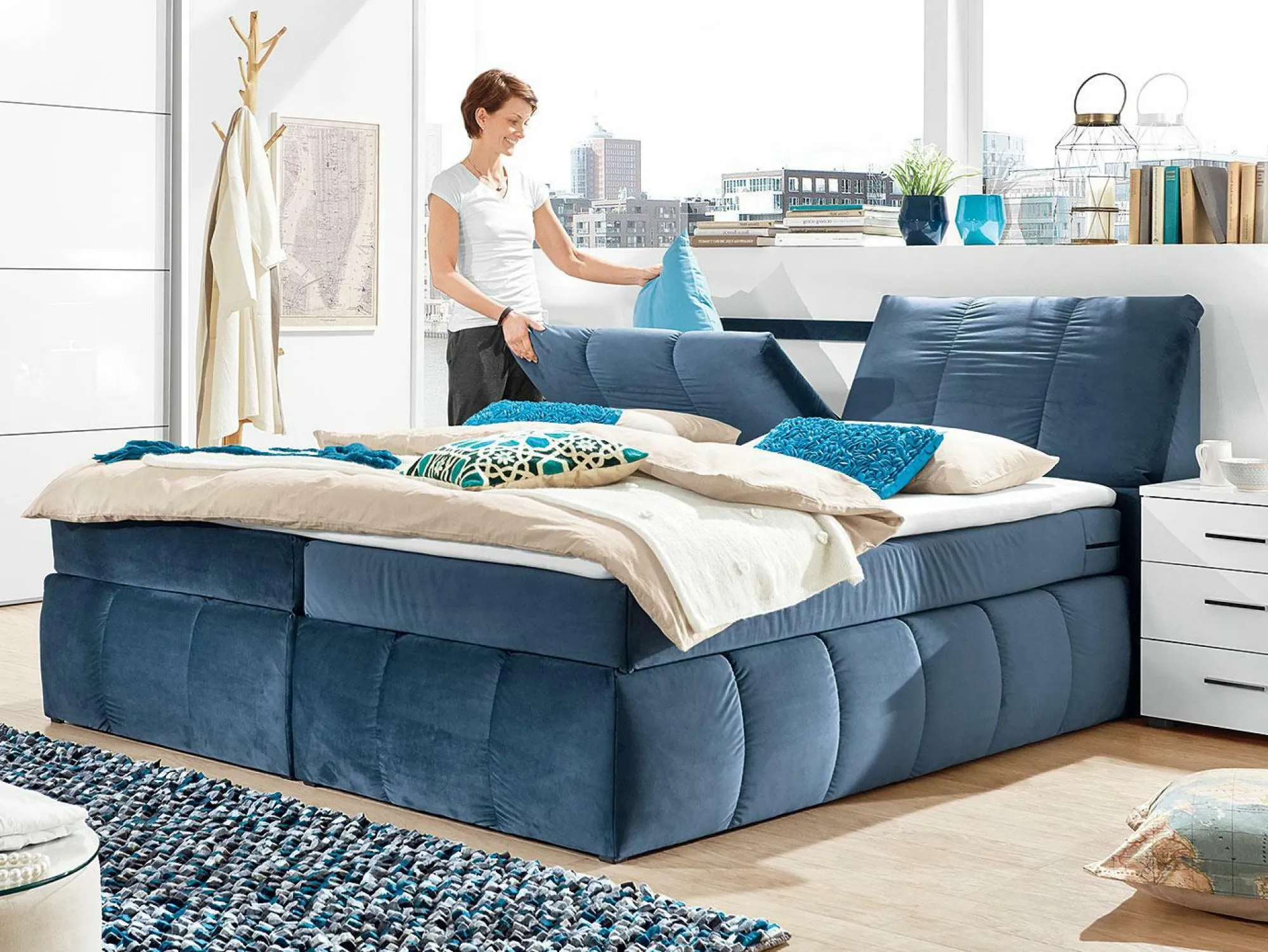 Das Boxspringbett Toledo 1 sorgt für einen erholsamen Schlaf und höchste Entspannung. Das Bett mit einem trendigen Bezug in Riviera Petrol setzt zudem einladende Akzente im Schlafzimmer. Das Bett ist mit Boxen aus Bonellfederkern ausgestattet und wird von Kunststofffüßen stabilisiert. Die Obermatratze besteht ebenfalls aus Bonellfederkern und ist mit Härtegrad 2 versehen. Ein besonderes Highlight ist das aufklappbare Kopfteil. Durch den Schaumtopper mit einer Höhe von 4 cm wird der Liegekomfort zus0ätzlich erhöht und ist dadurch besonders angenehm.