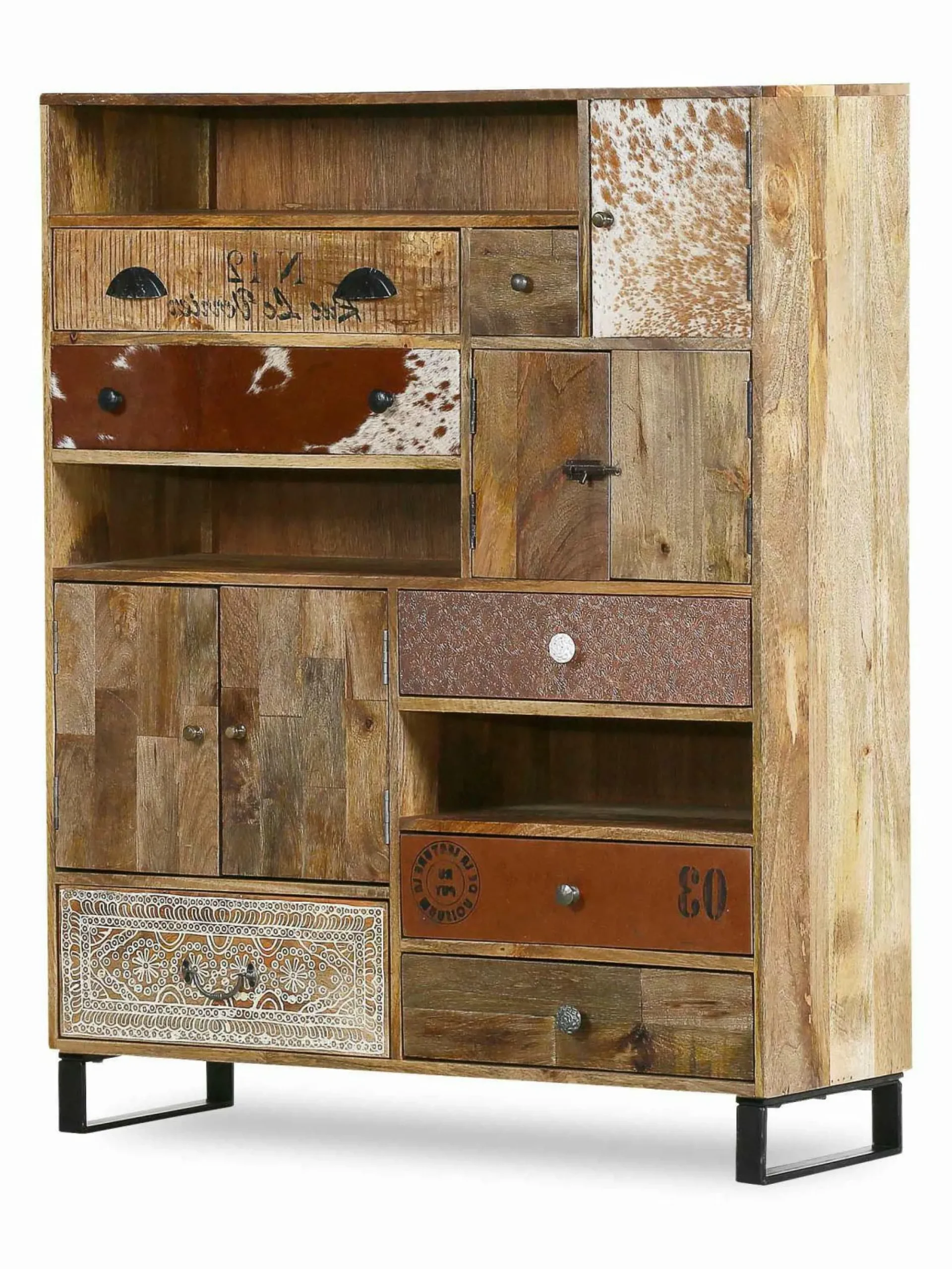 Ein ganz besonderes Schmuckstück, das vor allem durch einen extravaganten Stil auffällt, erhalten Sie mit der Kommode Bounce. Die außergewöhnliche Anrichte ist aus massiver, gebeizter und lackierter Mango gefertigt, deren edle Holzstruktur für Wärme und Gemütlichkeit im Wohnraum sorgt. Ausgestattet mit fünf Türen, sieben Schüben und drei Ablagefächern, bietet Bounce jede Menge Stauraum für Utensilien aller Art. Die verschiedenen Elemente der Kommode sind teils mit Ziegenfell, teils mit aufwendiger Schnitzerei oder einer Kupferplatte verkleidet und verleihen Bounce so einen vollkommen individuellen Charakter.