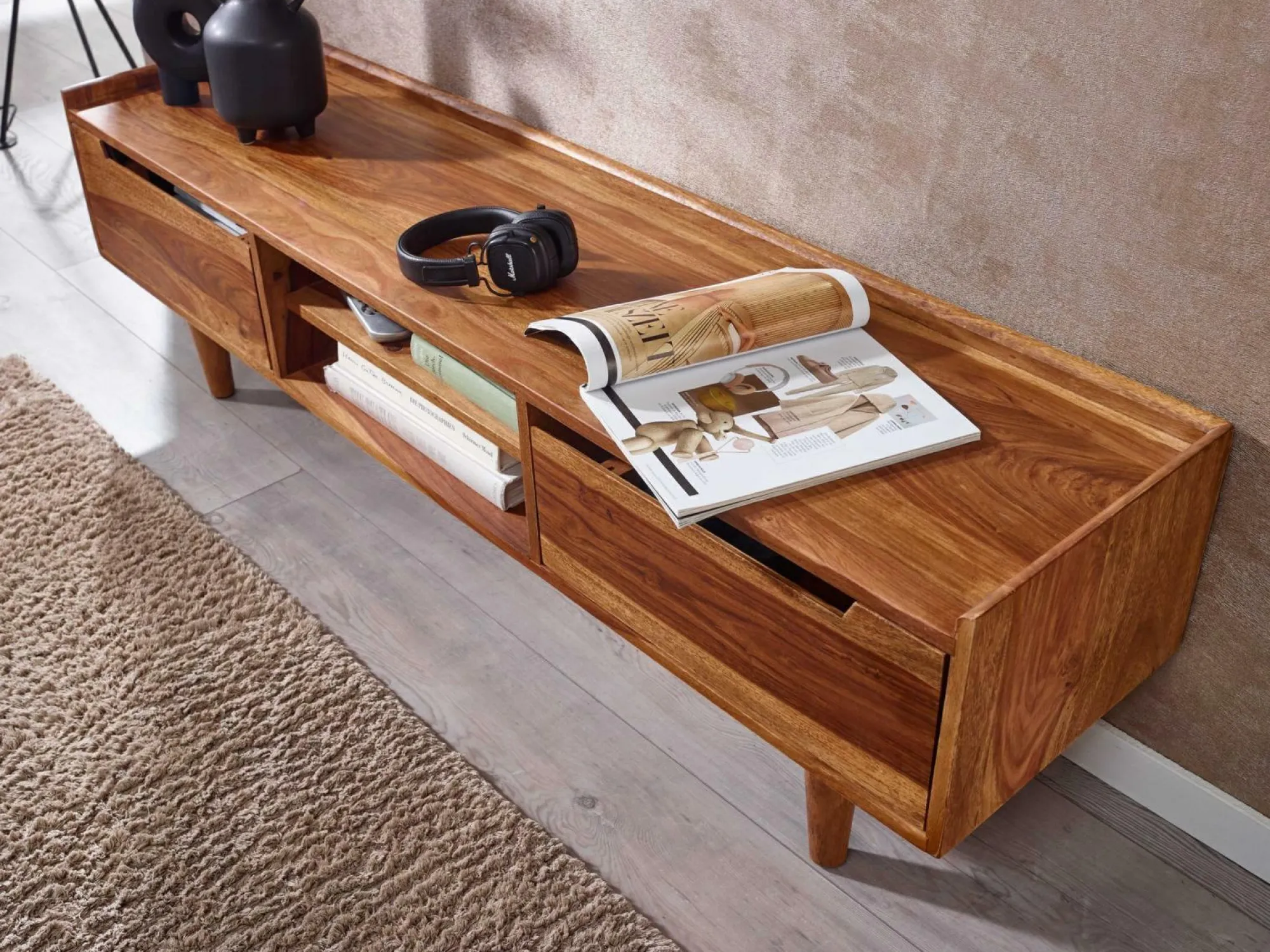· Lieferumfang – Geliefert wird ein Fernsehunterschrank ohne Dekoration.