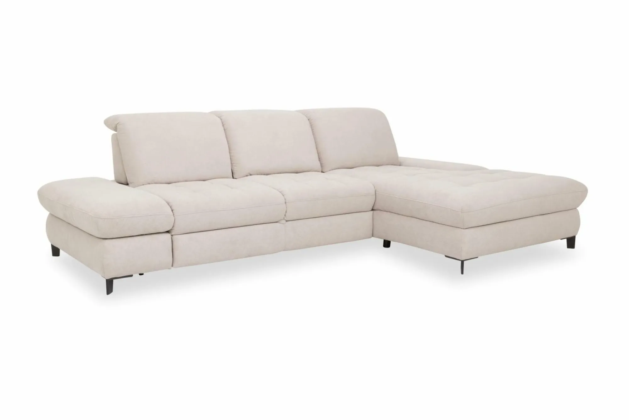 Die Polsterecke Salvi lädt zum Entspannen und Wohlfühlen ein. Das schlichte Design integriert sich wunderbar in nahezu jedes Wohnkonzept und sorgt für eine angenehme Atmosphäre. Die Couch ist aus einem hellgrauen Stoff (100% Polyester) gefertigt, auch der Rücken ist echt bezogen. Für ein weiteres optisches Highlight sorgt die Steppung der Sitzfläche. Die Couch steht sicher auf mattschwarzen Metallfüßen, die den Gesamtlook perfekt abrunden. Das Sofa besteht aus einem 2-Sitzer (links) und einem Longchair (rechts). Für einen angenehmen Sitzkomfort sorgen die Schwenkrücken, die Polsterung aus PUR-Schaum auf Wellenfedern, sowie die ergonomische Sitzhöhe von 43 cm. Auf Wunsch sind Funktionen erhältlich.