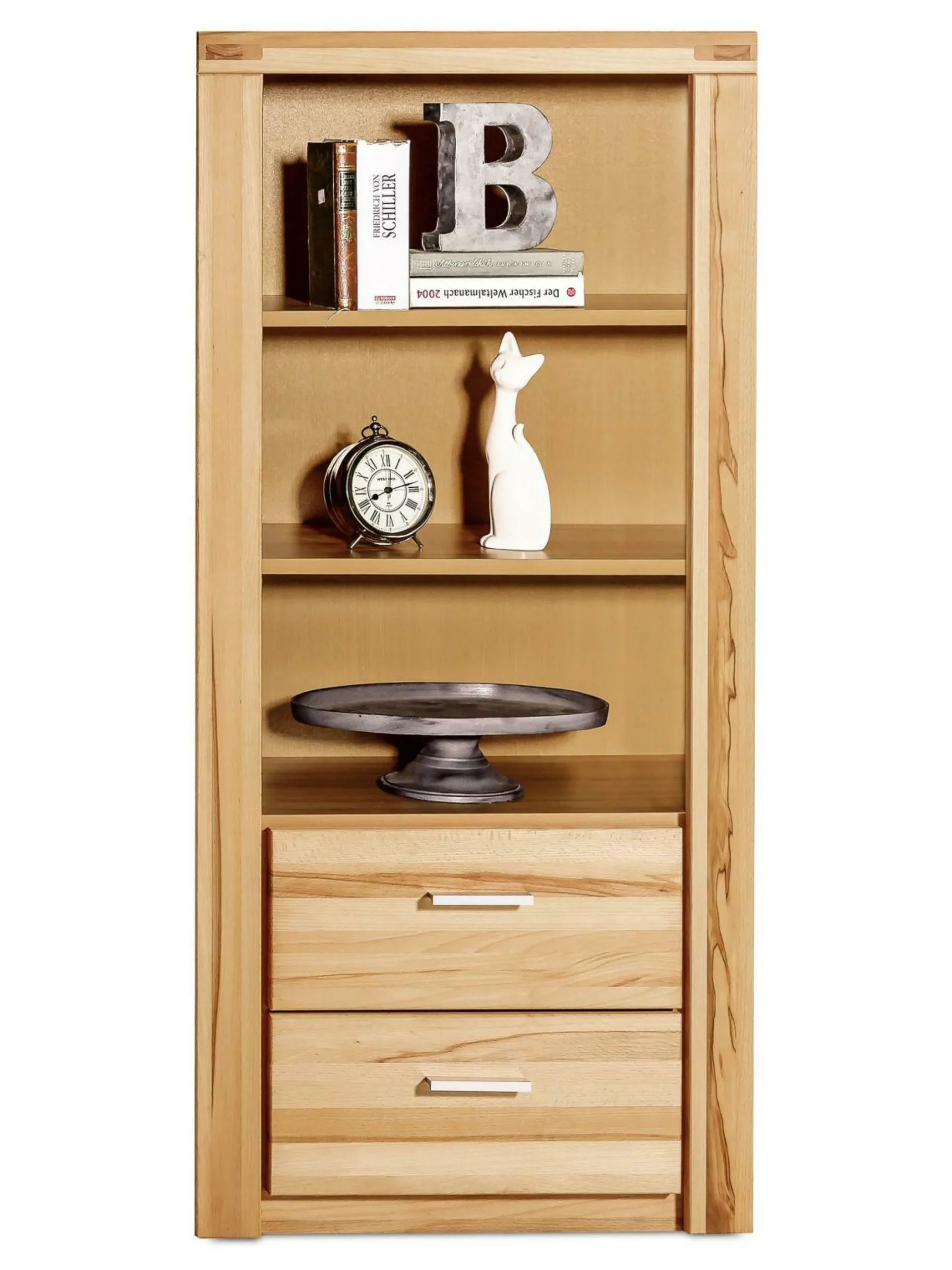 Ein stilvolles Stauraumelement, das mit Natürlichkeit und Klarheit überzeugt – Regal Tabea. Das Design des Schranks setzt sich aus massiven und geölten Fronten und Oberplatte aus Kernbuche und einem Korpus aus einer Kernbuche Nachbildung zusammen. Ausgestattet mit zwei Schubkästen und drei offenen Fächern finden Bücher, Dekoelemente und vieles mehr einen passenden Platz in Tabea.
