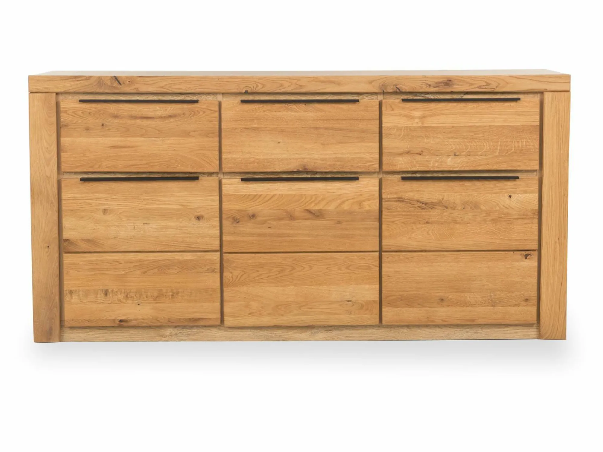 Natürlich und modern wirkt das Sideboard Greta. Die Front besteht aus geölter Eiche massiv, der Korpus und die Deckplatte erscheinen in einer Eiche-Nachbildung. Passenderweise ist das Sideboard mit Metallgriffen versehen. Sowohl in den drei Schubkästen als auch hinter den drei Holztüren steht Ihnen viel nicht-einsehbarer Stauraum zur Verfügung. Ergänzen Sie Ihren Raum um dieses formschöne Möbelstück.