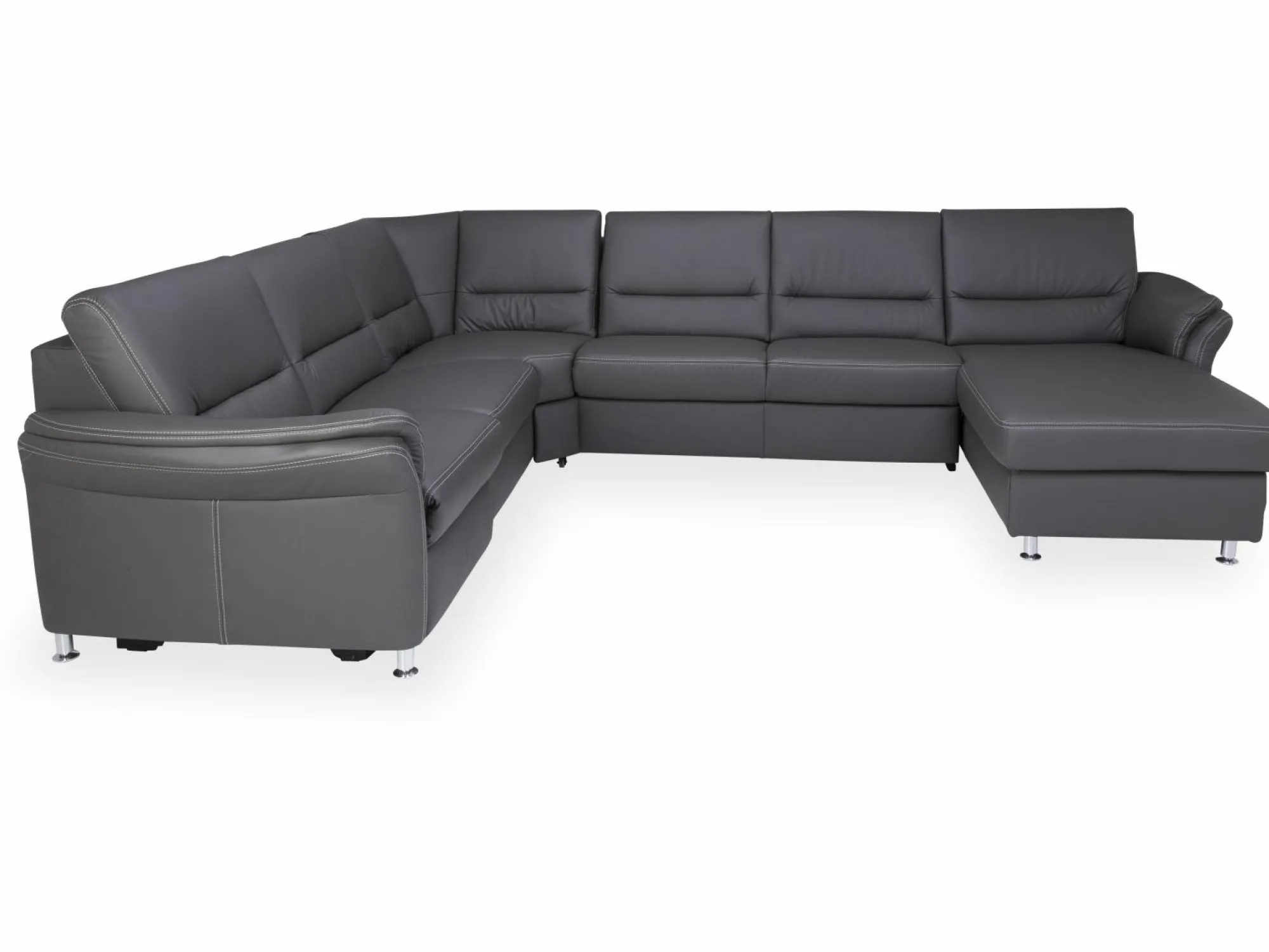 Genießen Sie schöne Stunden zusammen mit Ihren Liebsten auf der Polsterecke Systempolster Dakota aus dem Hause Massimo. Die moderne und gemütliche Optik wird Ihren Wohnbereich in eine echte Wohlfühloase verwandeln. Das Sofa besteht aus einer 2,5-Sitzer rechts, einer Rundecke und einem 2,5-Sitzer mit Armteil links. Die Polsterecke ist mit einem schicke Lederbezug bezogen und in verschiedenen Ausführungen erhältlich, sodass sich die Couch in nahezu jedes Wohnkonzept integrieren lässt. Des Weiteren ist das Sofa mit einer Kontrastnaht in beige versehen und rundet das Design perfekt ab. Auf Wunsch sind Funktionen und ein integriertes Bett erhältlich.