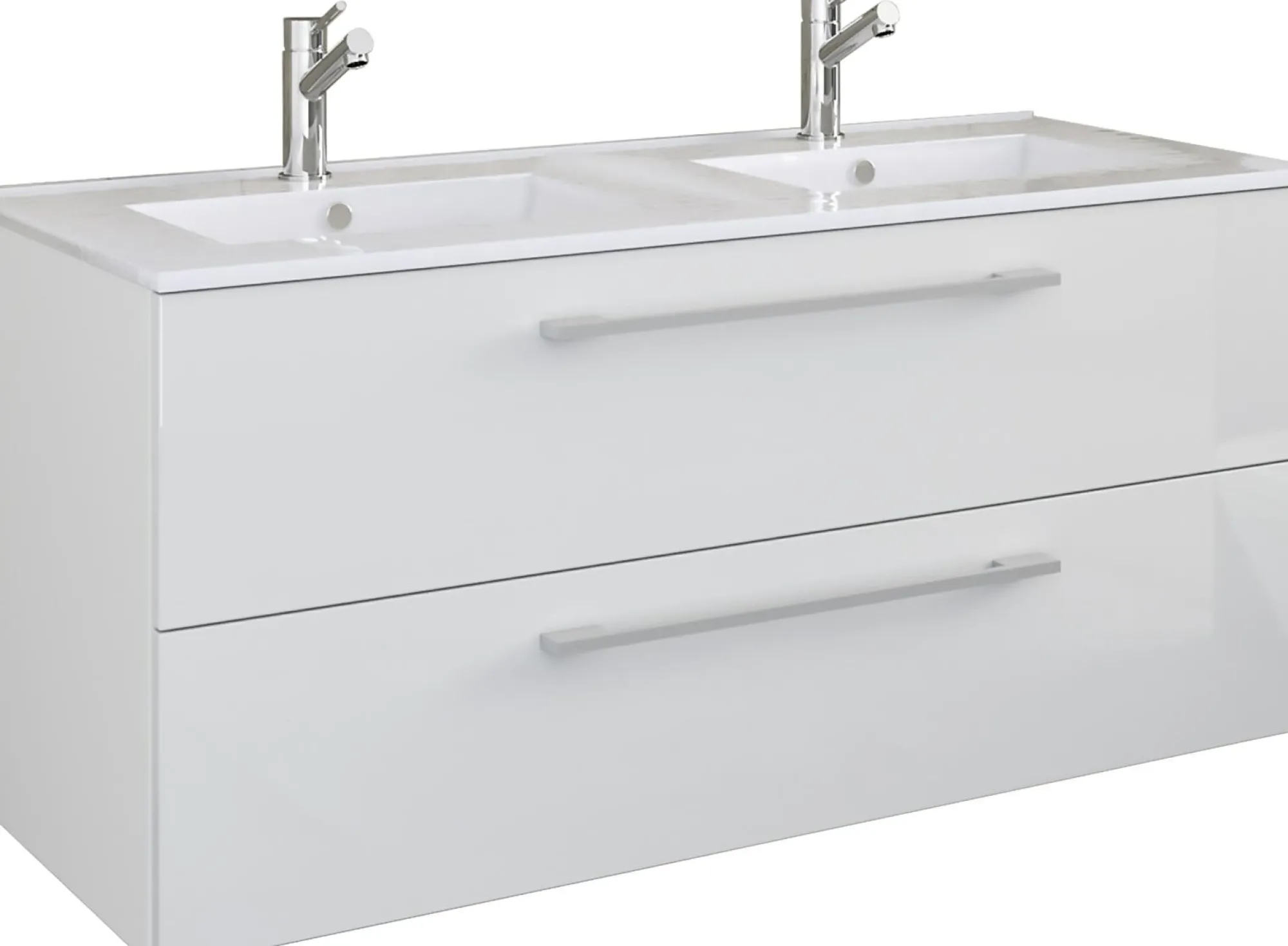· Als Eyecatcher dient das moderne Doppelwaschbecken aus massiver Keramik, das Ihrem Badezimmer ein ganz besonderes Ambiente verleiht