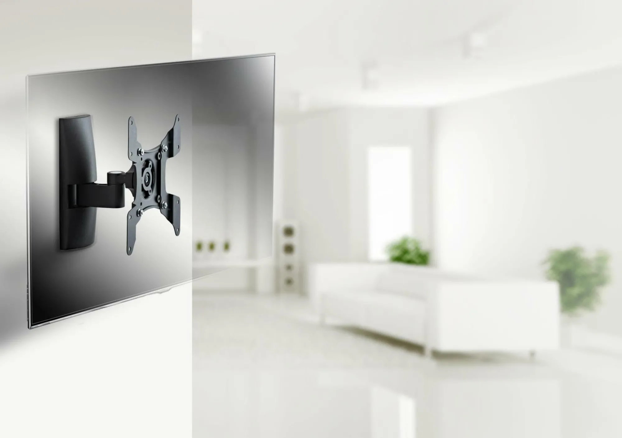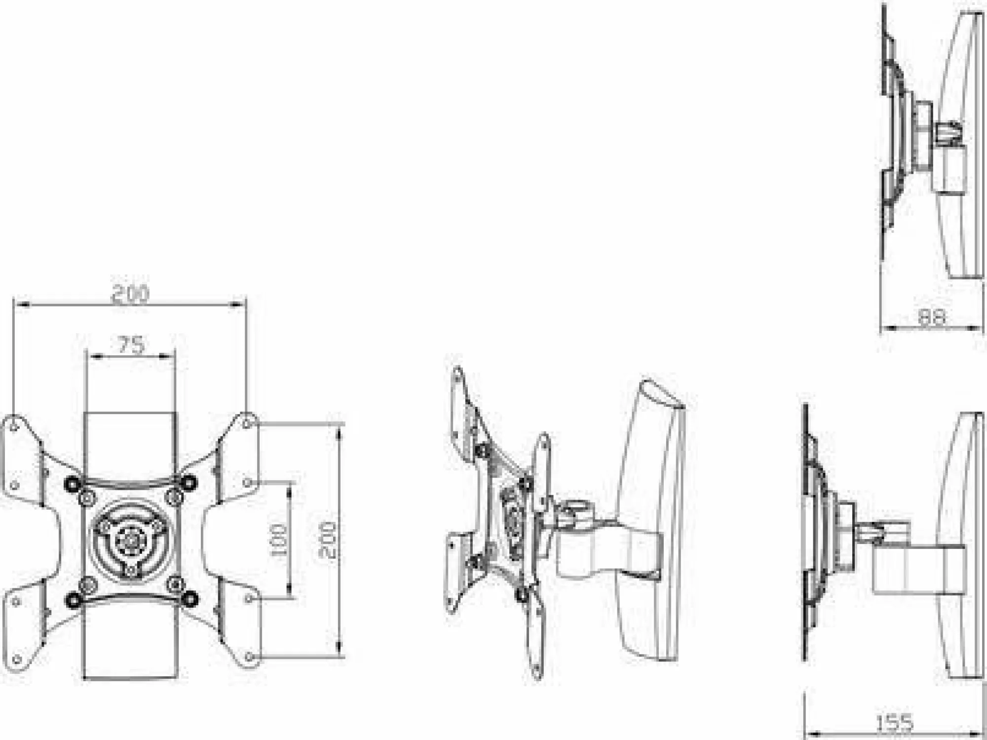 · VCM universelle Wandhalterung TS 1 Schwarz aus hochwertigem Aluminium. Für alle handelsüblichen Flachbildschirme von 15-37 Zoll (38-94 cm) bis max. 20 kg. Die Halterung hat 1 Gelenk. Wandabstand min. 8,8 cm max. 15,5 cm. Die Halterung ist 15 Grad nach oben und unten neigbar, hat einen Schwenkradius von bis zu 90 Grad seitlich und ist um 360° drehbar und somit auch im Portaitformat verwendbar. VESA-kompatibel mit 75×75,100×100, 100×200, 200×100 und 200×200 mm. Die Lieferung erfolgt teilmontiert inklusive aller Befestigungsmaterialien und Montagematerial. Produktmaße: Länge/Breite 22,0 x Tiefe 15,5 cm.
