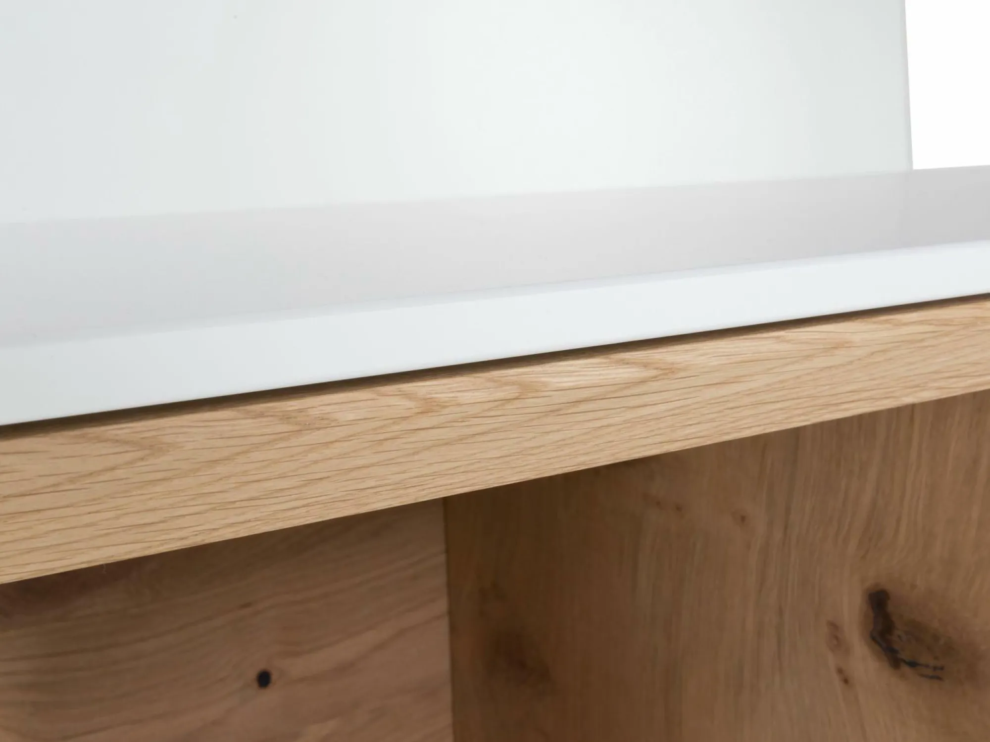 Ausführung: Korpus + Front Lack kristallweiß matt Offene Fächer: Wildeiche hell soft gebürstet geölt, Griffe: Edelstahloptik, 4-türig, 2 Holzböden, verstellbar, 2 Konstruktionsböden, 2 Schubkästen mit Vollauszügen, 2 offene Fächer, Auf Wunsch: Beleuchtung