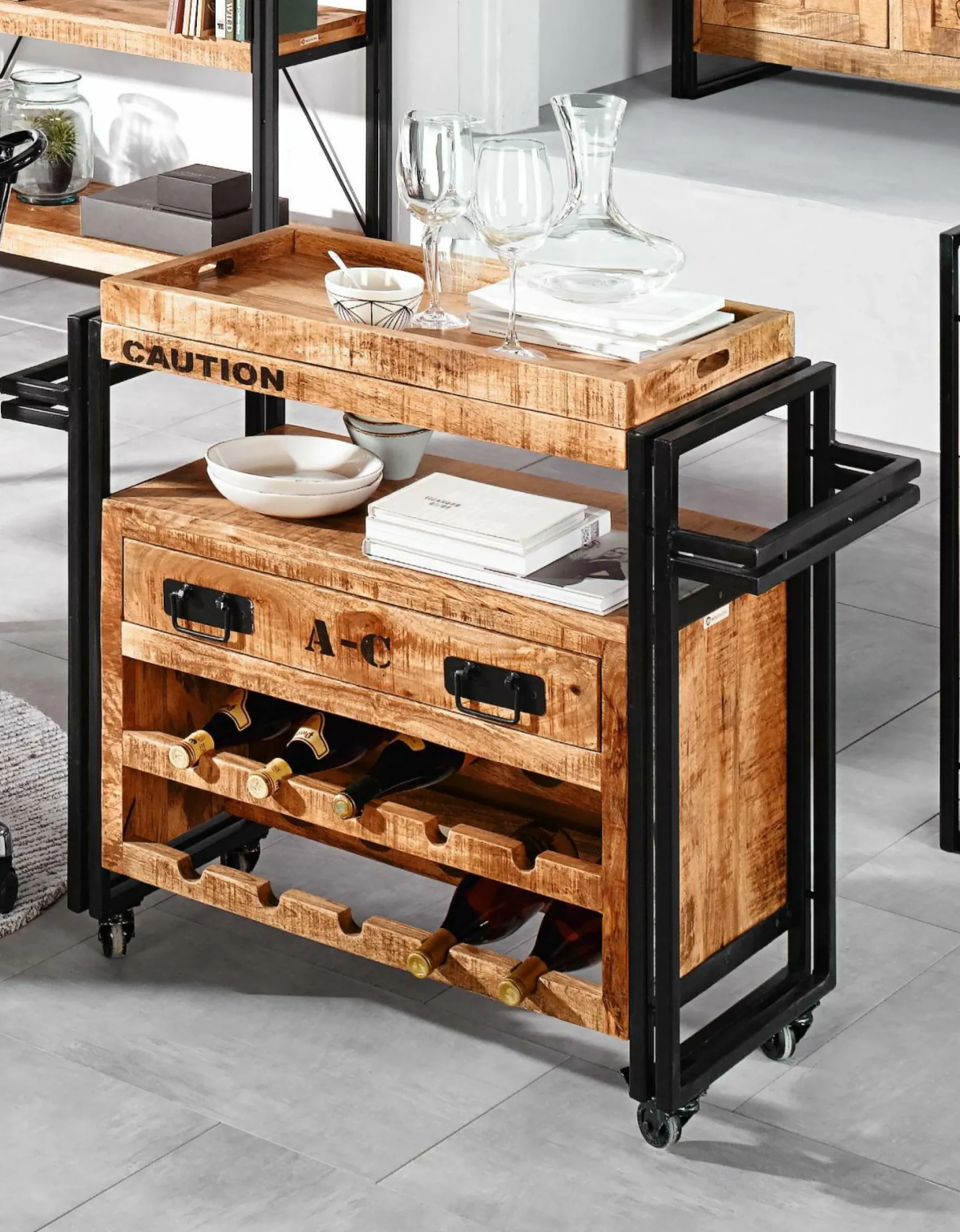 Der Küchenwagen Iron von WOLFMÖBEL sorgt für natürlich-schöne Akzente in Ihrem Wohnbereich. Der praktische Wagen bietet viele Verstaumöglichkeiten für Flaschen, Teller und diverse weitere Utensilien. Der Wagen aus hochwertigem Mangoholz und Eisenstangen wird zu einem schicken Hingucker. Dank der vielen Staumöglichkeiten können Sie Speisen und Getränke bequem transportieren. Durch die vier leichtgängigen Rollen ist der Servierwagen flexibel einsetzbar. Der Küchenwagen verfügt zudem über eine abnehmbare Ablage, die als Tablett eingesetzt werden kann.