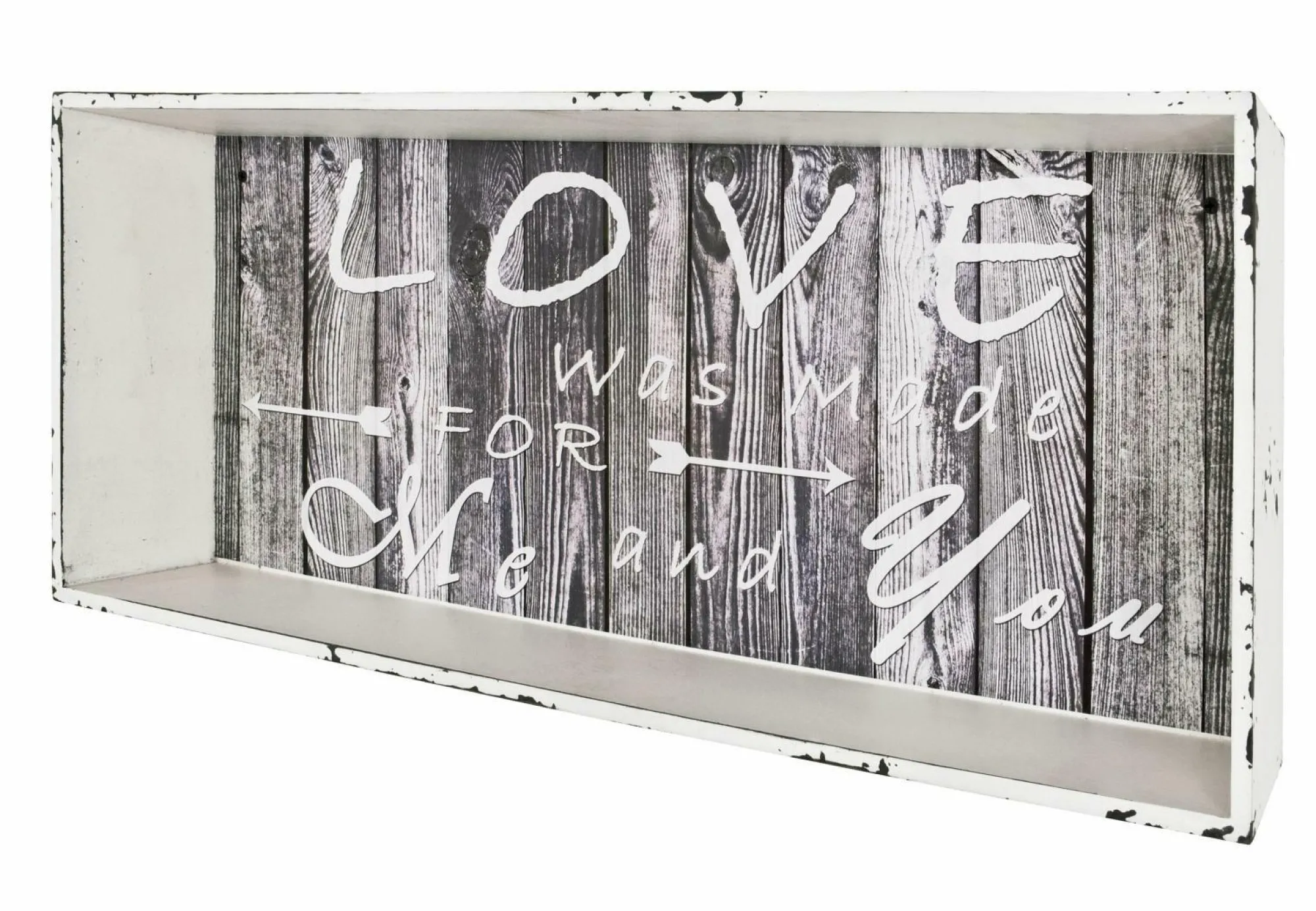 Dieses Wandregal präsentiert ein ganz spezielles Design und spendet Ihnen nützlichen Stauraum. Insgesamt besteht das Regal aus MDF, wobei der Außenrahmen weiß gewischt und die Innenwand mit einem Schriftzug in Vintage-Optik versehen ist. Dabei ist das Regal 76 cm breit, 30 cm hoch und 12 cm tief. In diesem Wandregal können Sie diverse Gegenstände wunderbar zur Schau stellen und Ihrem Wohnraum einen persönlichen Touch verleihen.