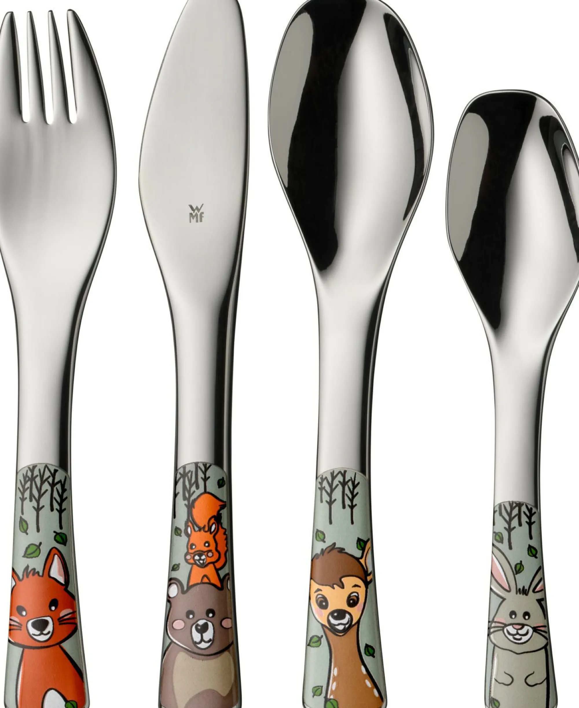 · WMF Kinderbesteck-Set: Kindgerechtes Design Die Waldfreunde von WMF werden die besten Freunde Ihres kleinen Essers sein. Mit diesem kindgerecht gestalteten 4-teiligen Kinderbesteck-Set mit einer ungewöhnlichen Truppe bester Freunde, das die Selbstständigkeit beim Essen fördert soll, wird jede Mahlzeit zu einem Abenteuer. Hirsch, Bär, Fuchs, Hase und Eichhörnchen heißen Ihr Kind liebevoll in ihrer Welt willkommen. Im kompletten Set enthalten sind eine Gabel, ein Messer, einen Löffel, einen kleinen Löffel für Kinder ideal, um die Freude am selbstständigen Essen zu entdecken.