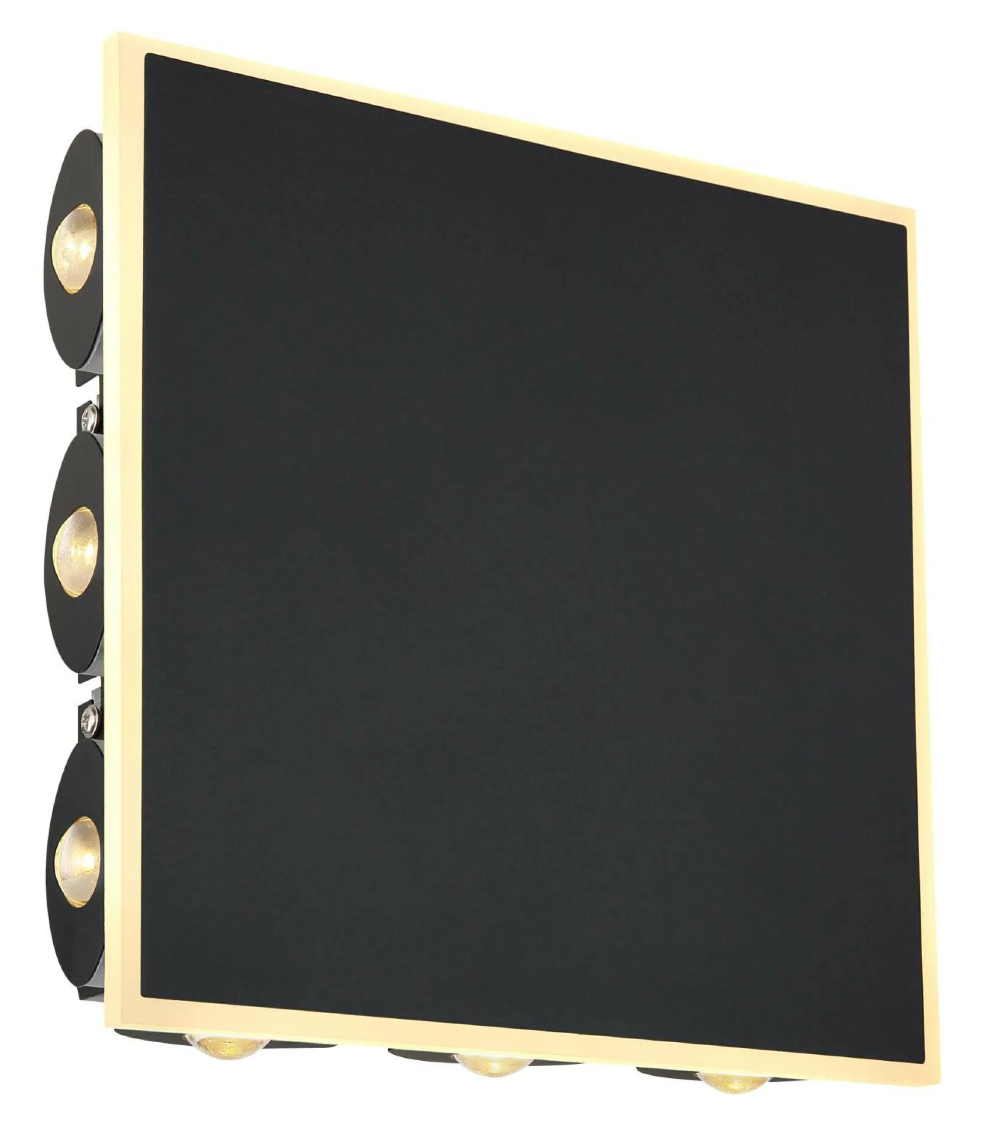 · Die Wandleuchte der Serie SAIDY ist aus schwarz mattem Metall gefertigt einen klaren Kunststoffrahmen. Die Abmessungen betragen BxH: 220x220mm mit einer Anbautiefe von 50mm. Die Leuchte wird inklusive einer LED mit einer Leistung von 12W und einer Spannung von 230V geliefert. Die maximale Lichtleistung beträgt 1600lm bei einer Farbtemperatur von 3000K. Die tatsächliche Lichtleistung beträgt 850lm.