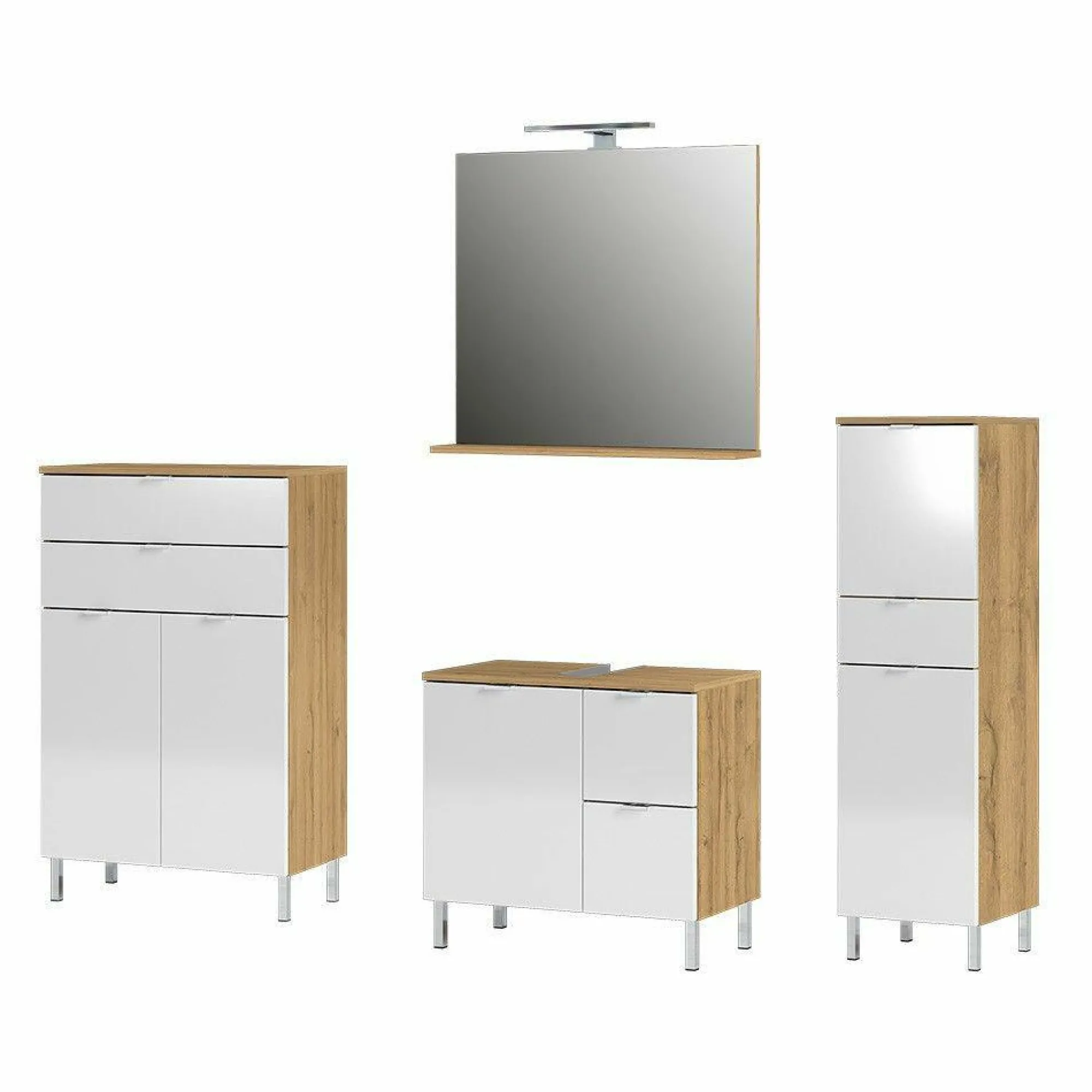 · Badmöbel-Set bestehend aus einem Waschbeckenunterschrank, einer Kommode, einem Schrank und einem Spiegel, Waschbeckenunterschrank mit zwei Schubladen rechts und einer Tür links – dahinter ein verstellbarer Einlegeboden, Oberboden mit Aussparung für Siphon, Kommode mit zwei Schubladen und zwei Türen – dahinter zwei verstellbare Einlegeböden, Schrank mit einer Schublade und zwei Türen