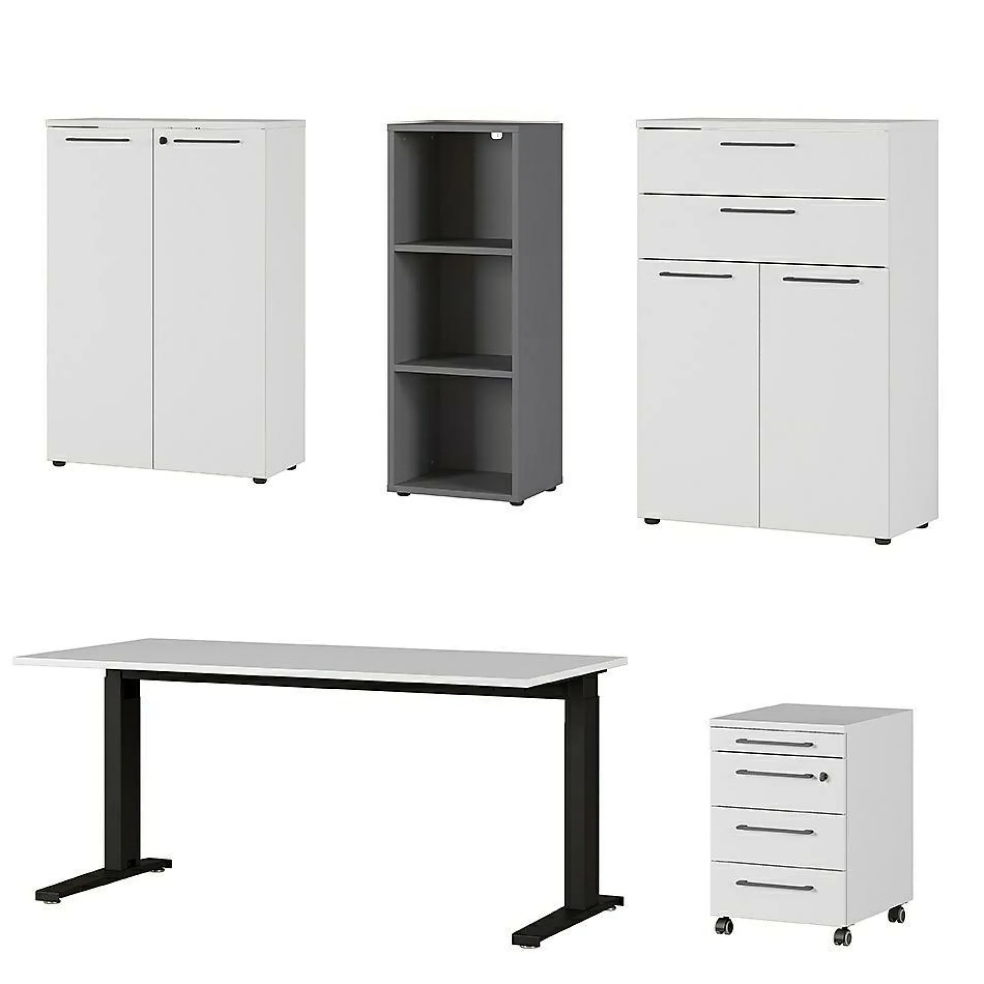 · Büromöbel-Set bestehend aus einem Schreibtisch, einem Rollcontainer, zwei Aktenschränken und einem Aktenregal, Mechanisch höheneinstellbarer Schreibtisch mit zwei C-Füßen, Tischplatte (belastbar bis zu 80 kg) in der Farbe Lichtgrau, Gestell aus pulverbeschichtetem Metall in Schwarz, Höhe einstellbar von 68-88 cm, Rollcontainer mit vier Schubladen, oberste Schublade mit Utensilienfach, zweite abschließbar, vier schwarze Laufrollen, zwei davon feststellbar, Möbel in der Farbe Lichtgrau, ein Aktenschrank mit zwei abschließbaren Türen, dahinter zwei verstellbare Einlegeböden, ein Aktenschrank mit zwei Schubladen und zwei Türen, dahinter ein verstellbarer Einlegeboden, in der Farbe Lichtgrau, Aktenregal mit zwei verstellbaren Einlegeböden in der Farbe Graphit, insgesamt zehn Bügelgriffe aus Metall in Silber und 14 schwarze Möbelgleiter aus Kunststoff, Melaminharzbeschichtung, ABS-Kanten, Selbsteinzug der