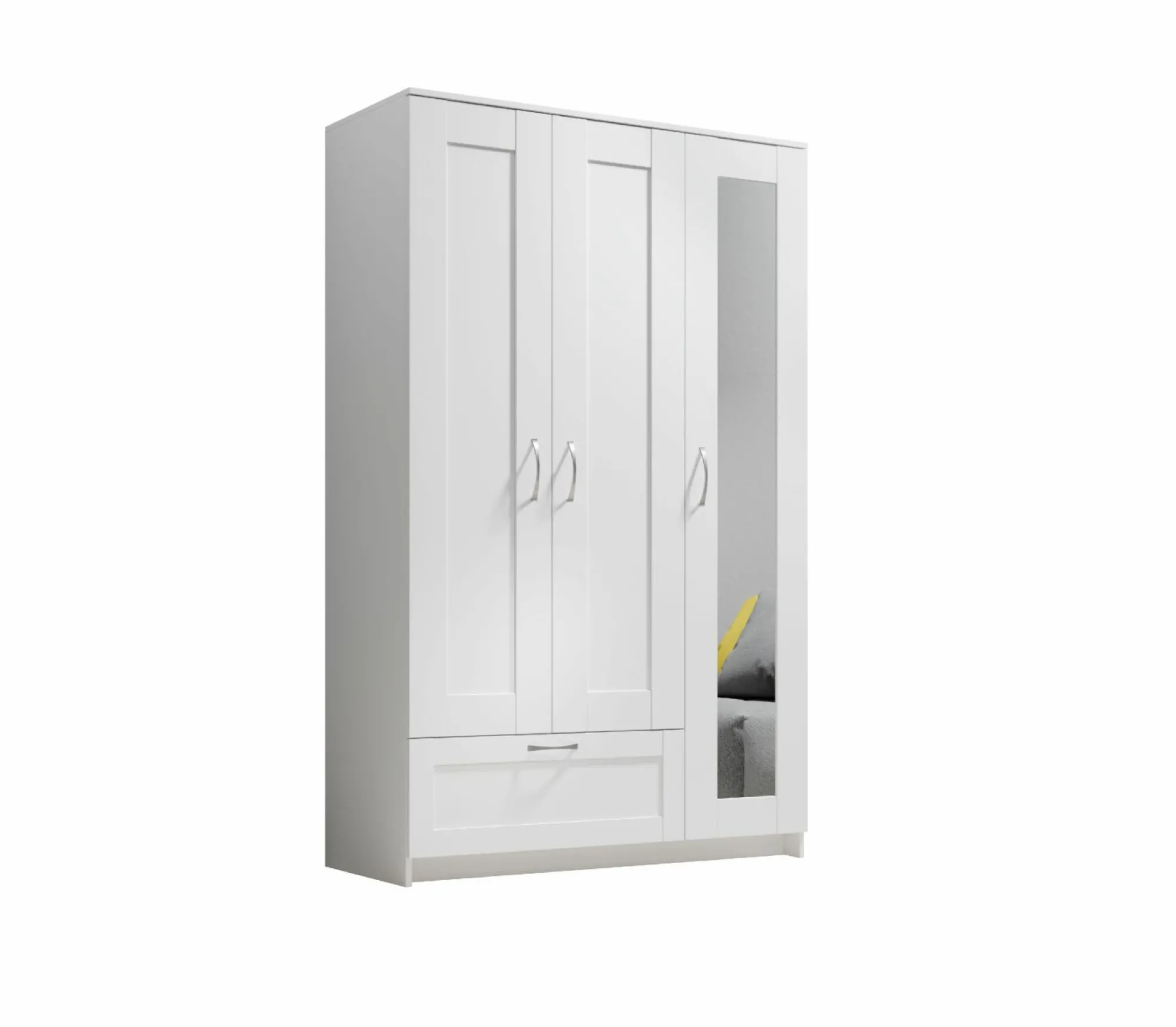 · mit zwei Holztüren, einer Spiegeltür, einer Schublade, einer Mittelseite, drei Einlegeböden und einer Kleiderstange