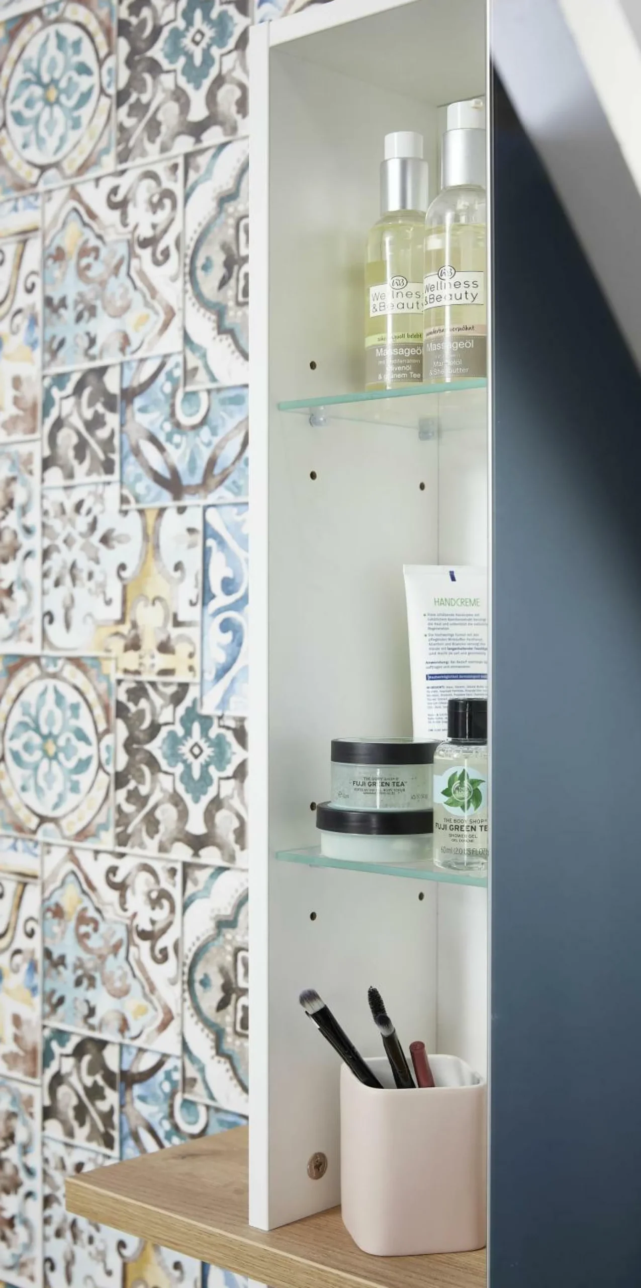 · Spiegelschrank mit einer Spiegeltür, dahinter zwei verstellbare Einlegeböden (jeweils belastbar bis zu 10 kg), daneben ein offenes Fach mit zwei verstellbaren Einlegeböden aus Glas (jeweils belastbar bis zu 1 kg), darunter ein überstehender Konstruktionsboden, wodurch seitlich zwei zusätzliche Ablageflächen entstehen, unterhalb ein offenes Fach (belastbar bis zu 10 kg), am oberen Rand eine LED-Beleuchtung (30x10x4,2 cm, neutralweißes Licht), Konstruktionsboden in Navarra-Eiche-Nb., der Rest in Weiß, Melaminharzbeschichtung, griffloses Design, hochwertige ABS-Kanten, inkl. Steckdose, Türdämpfung, Made in Germany.